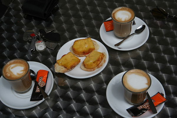 für Euch ein Bild von Ponferrada, hier haben wir einen leckeren Café con leche getrunken. Wir durften unsere Motorräder in der Fußgängerzone zwischenparken.