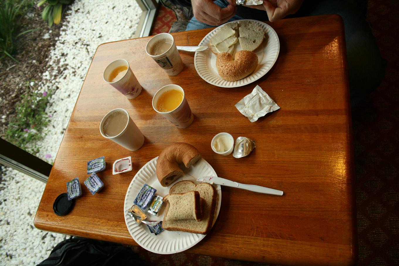 Gestern beim Einchecken war gesagt worden, es gäbe in der Lobby Frühstück mit Saft, Kaffee und Muffins. Eigentlich war kein Frühstück im Preis erhalten.