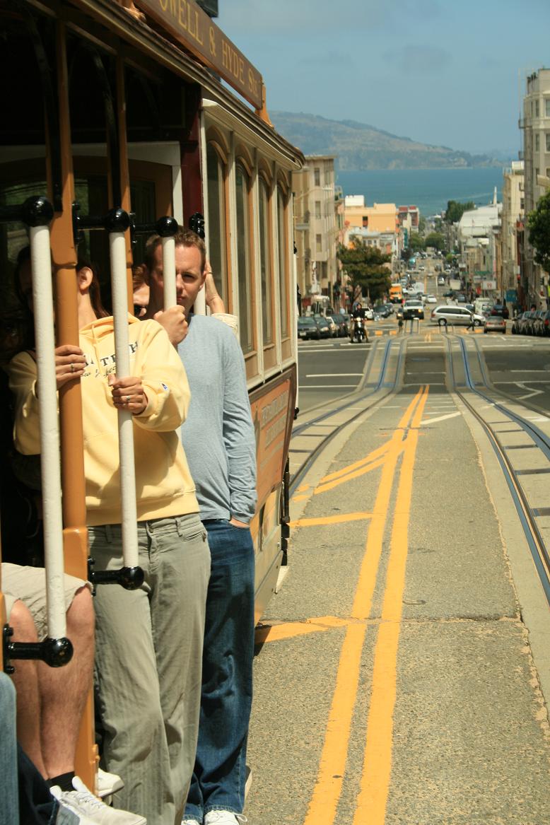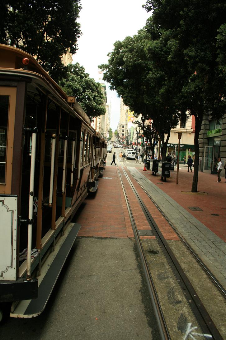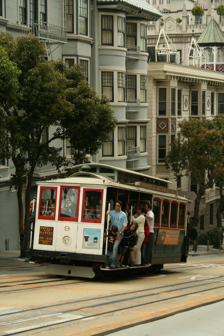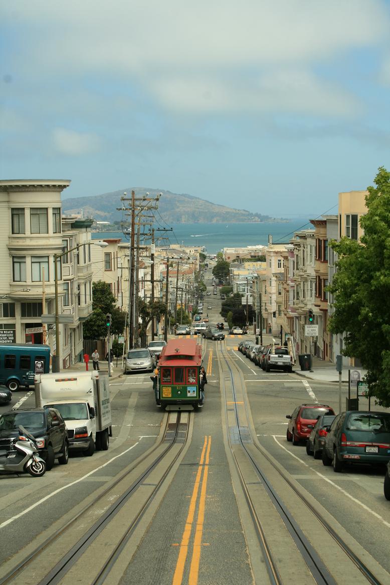 Aber schließlich finden wir in verschiedenen Läden unser Frühstückszubehör: 4 dicke fest gebackene Pagels, Butter, ein Stück Käse, eine Packung Wurst und Milch. Damit ziehen wir zurück ins Hotel. Die Bagels machen so satt, dass wir nur jeder 1 1/2 schaffen und den 4. als Wanderproviant mitnehmen.Dann geht es los. WIr laufen die Geary Richtung Powellstreet und die Powellstreet runter zum Startpunkt der Cable Car Bahn, an dem man auch den Muni-Paß kaufen kann, der uns erlaubt, Busse und Cable Cars undd historische Straßenbahnen für 3 Tage zu nutzen. 18 Dollar kostet das pro Person. Es gibt eine lange Warteschlange beim Einsteigen und eine etwas kürzere für die Fahrkarten. Wir teilen uns strategisch auf – einer wartet, einer kauft.