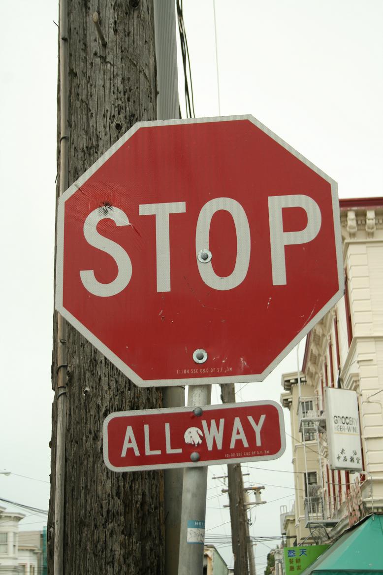 Wir laufen die Powelstreet entlang, auf der auch Cable Cars fahren. Morgen kaufen wir ein 3- Tage Ticket- heute wird gelaufen. Wer ist eigentlich bloß auf die Idee gekommen, dass wir hierherfahren? Wir sind doch keine Bergwanderer, und es geht mächtig bergauf und bergab. Auf Jans Stirn kommen schnell die Schweißperlen und selbst mir wird warm.Hier gibt es viele Kreuzungen, wo alle vier Straßen ein Stoppschild habe - irre, aber es funktoniert einwandrei