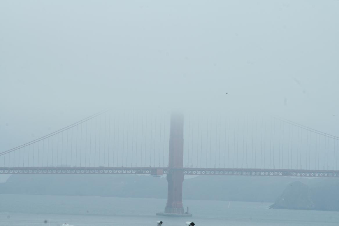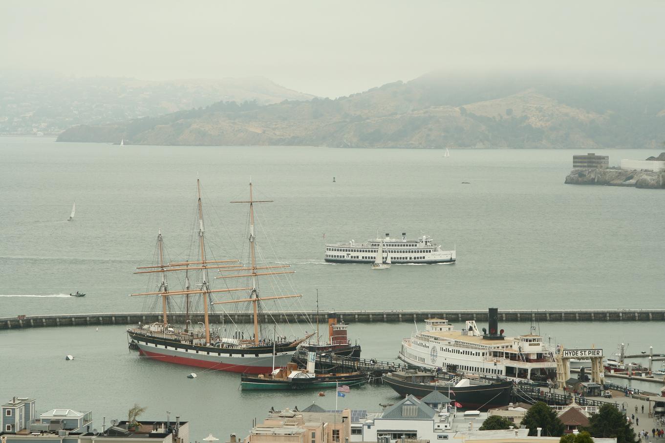 Wir laufen jetzt die Hydestreet runter Richtung Pier 49 (meine ich jedenfalls) oder Hydestreet Pier. Dort liegen einige Museumsschiffe. Unterwegs gibt es einen ersten Blick auf die Golden Gate Bridge, die heute stark eingehüllt ist.