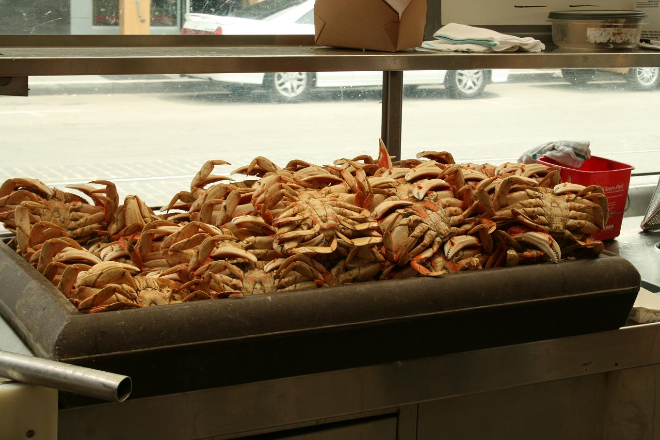 Außerdem das letzte noch erhaltene fahrtüchtige Liberthy Schiff aus dem 2. Weltkrieg, die S.S.. Jeremiah O`Brien- auch 8 Dollar, Im Maschinenraum des Schiffes wurden Filmszenen für den Film "Titanic" gedreht. Jan geht rauf, ich schreibe Postkarten.Dort ist auch die Fishermanwharf, eine Straße, in der sich Fischrestaurants und Krabbenstände reihen.Dort gibt es u. a. die Boidins Bakery, die das herzhafte Sauerteigbrot backt, für das San Francisco bekannt ist (wir haben es noch nicht gegessen). Man kann die Bäcker von außen bei ihrer Arbeitt beobachten.