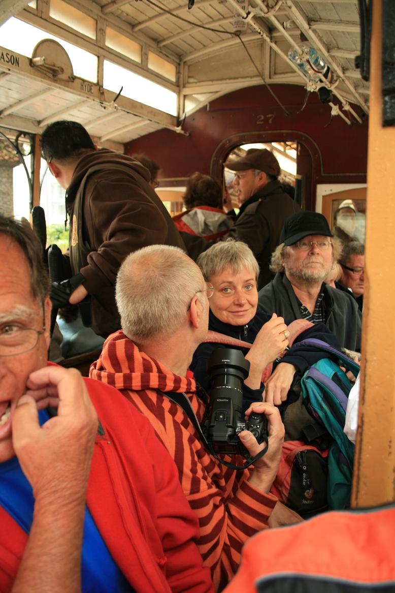 Es dauert einige Zeit, ca. 5 Bahnen, bis es dann losgeht. Jan erwischt einen Sitzplatz auf der Seitenbank und muss dann auch meinen Rücksack mit verstauen, ich stehe ganz vorne links auf dem Außenbrett – vis a`vie mit dem Verkehr. Das ist irre! -