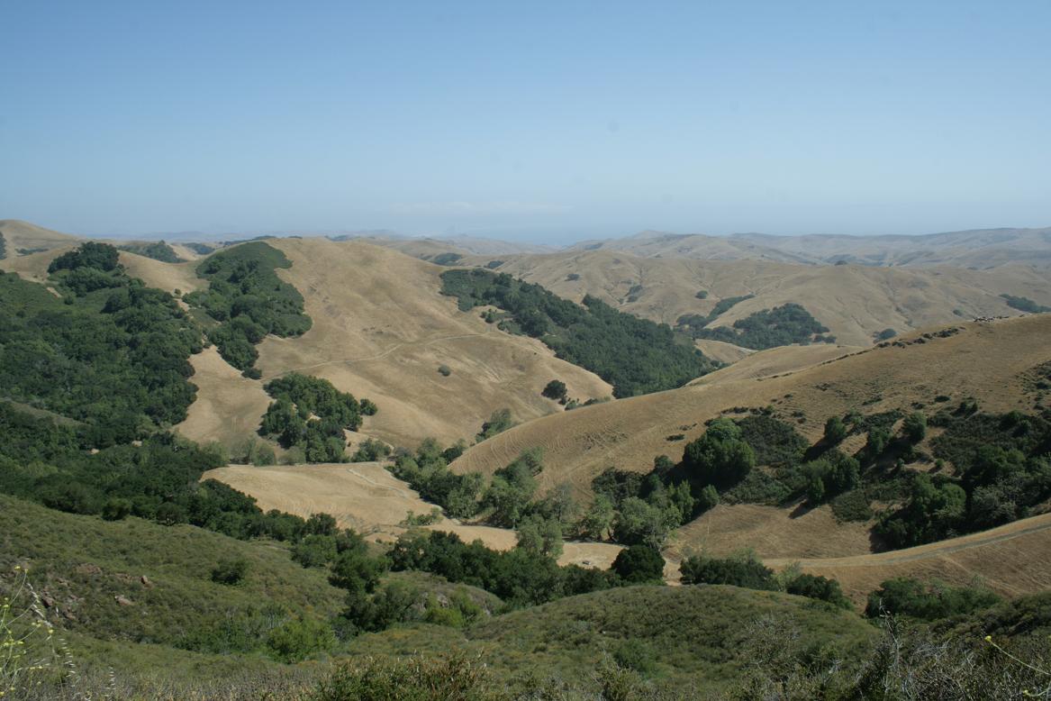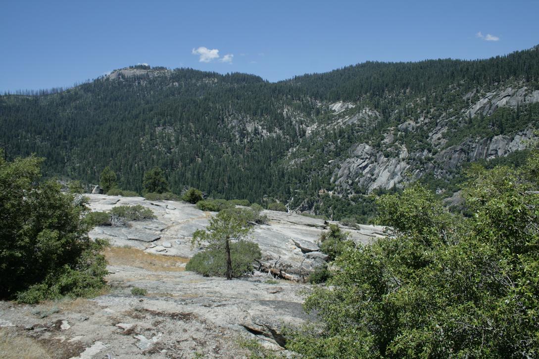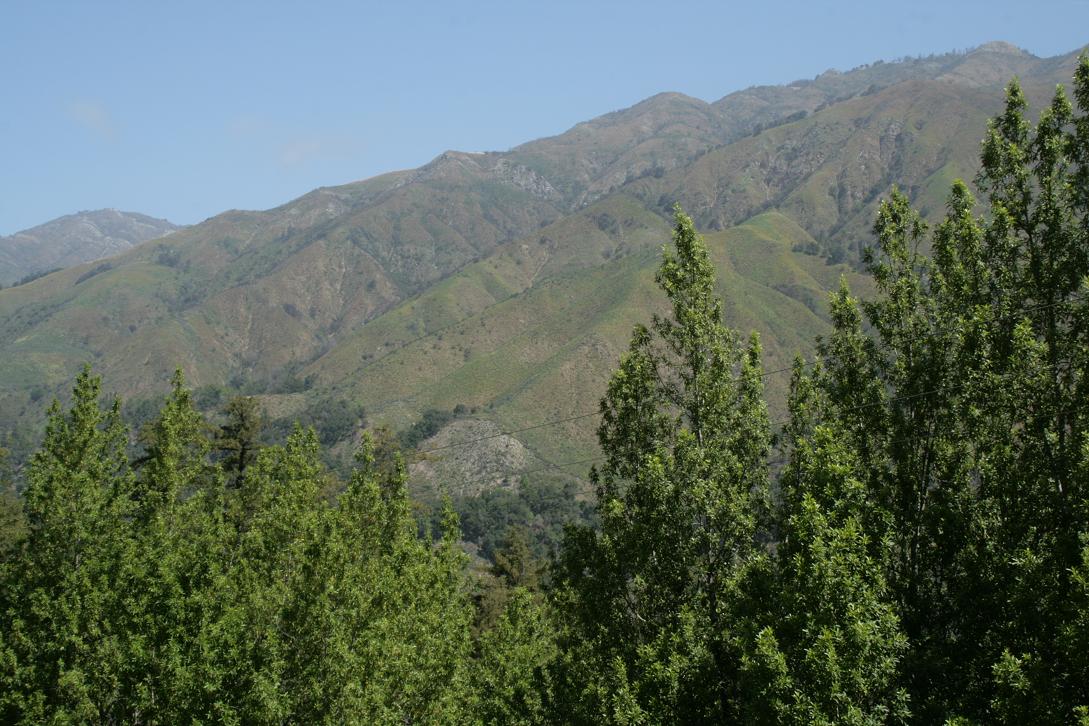 Die Landschaft ist hügelig. An Anfang finden sich Olivenhaine. Es erinnert an Spanien, oder Mallorca, oder Griechenland. Dann kommen wir höher,m fahren Serpentinen und durch Nadelwald mit hohen Bäumen. Es geht bis auf 5000 Fuß hoch. Unterwegs immer wieder große Bereiche in denen es gebrannt hat und wo nur noch schwarze Baumstümpfe stehen. -