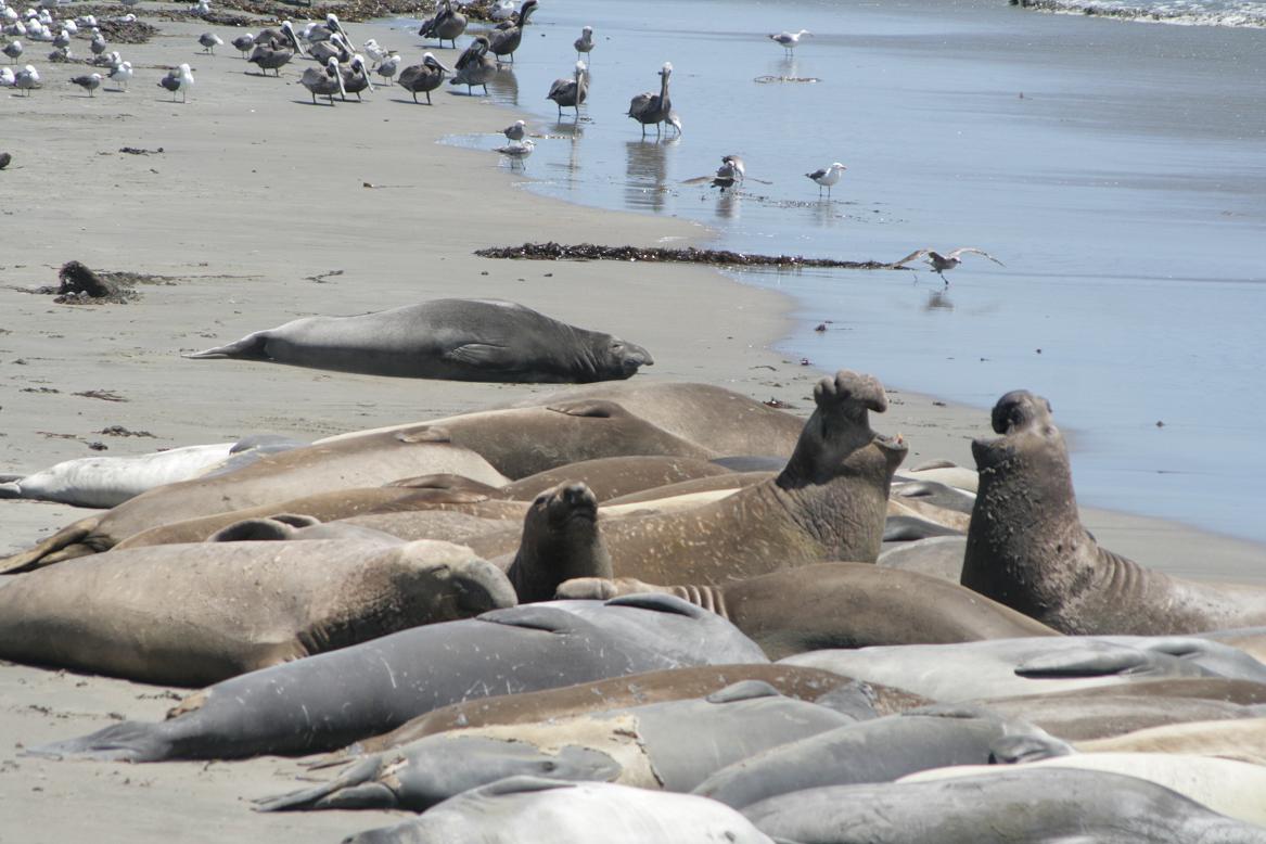 Vor uns ist ein Vista Point angezeigt. Viele Autos stehen dort, also muss es was zu sehen geben. UND WAS ERST! Das ist das highlight es heutigen Tages. Hier ahlen sich rund 200 Seeelephanten am Strand, umgeben von etlichen Seevögeln einschließlich Pelikanen, und warten auf ihren Fellwechsel. Hierzu schreibe ich noch ausführlicher und mein Fotoapparat macht ein Bild nach dem anderen. Nud 10m entfernt stehen wir neben ihnen. Sie stört es nicht. Ich stelle später noch mehr Fotos unter Reisefotos ein. Hier ein erster EIndruck. Wir sind hin und weg....