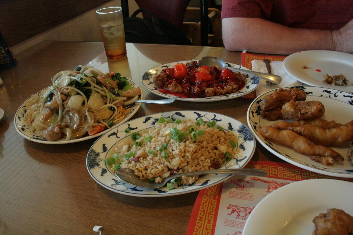 Also fahren wir die Straße, in der das Hotel liegt, entlang und finden einen Chinesen. In Amerika ist es übrigens üblich, dass man nicht einfach einen Tisch ansteuert, sondern sich zu einem Tisch führen lässt.WIr bestellen ein DInner für zwei – Es gibt eins Suppe, fritierte Chickenwings und Krabben und dann noch weitere Gerichte – ich bekomme gar nicht alles auf das Foto – und erst recht kann man das nicht schaffen zu essen.
