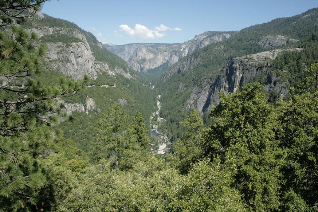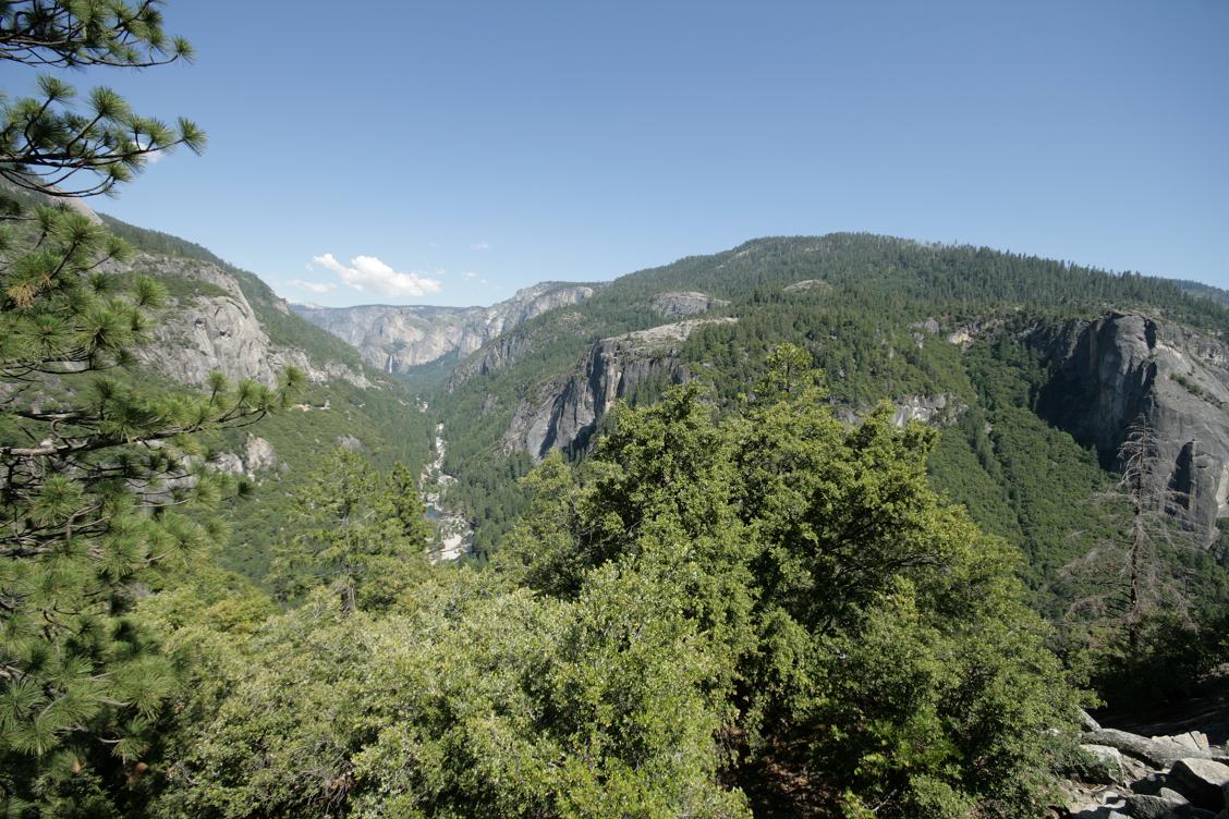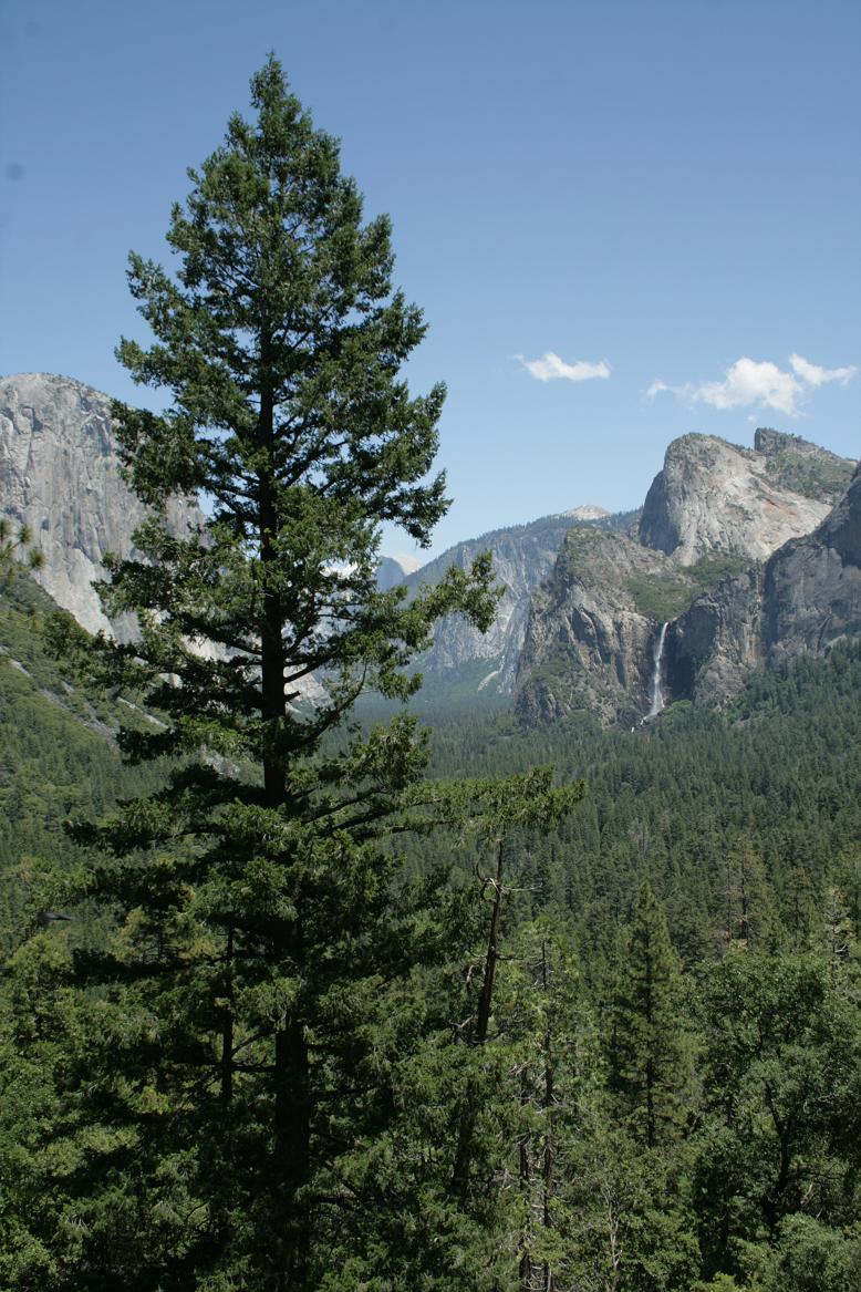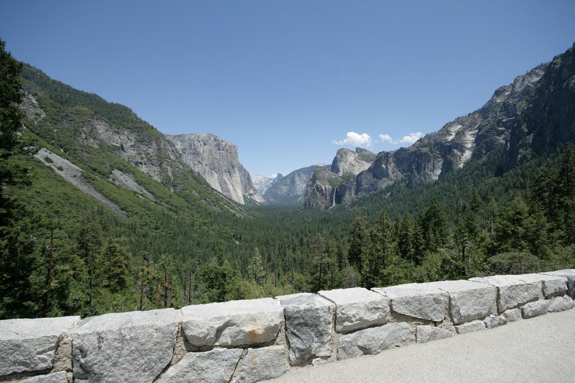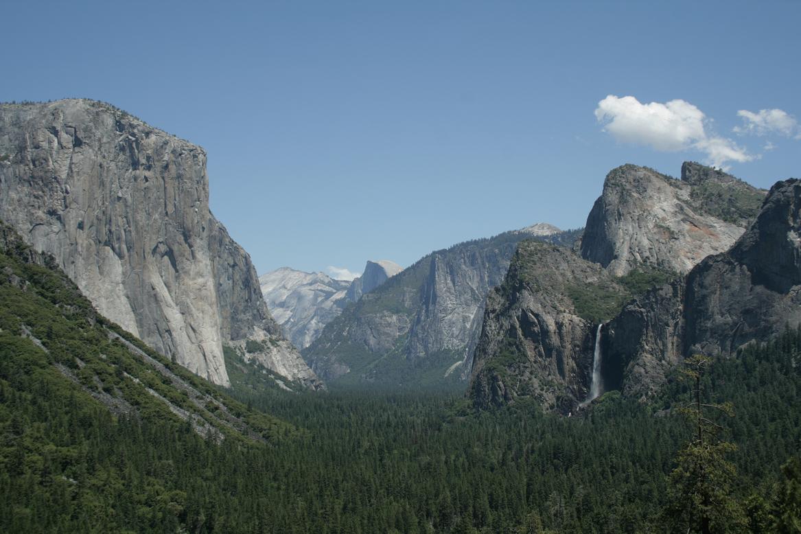 Da wir an einem Tag ohnehin nur einen kleinen Teil des Parks sehen können, beschließen wir den Kernweg um Yosemitevillage abzufahren.Zunächst müssen wir uns weiter hocharbeiten. Dann durchqueren wir einen Tunnel und dahinter findet sich ein phantastischen Ausblick auf drei der wesentlichen Sehenswürdigkeiten: Die Felsen der Kapitän, Half Dome und der Wasserfall Bridalveill.