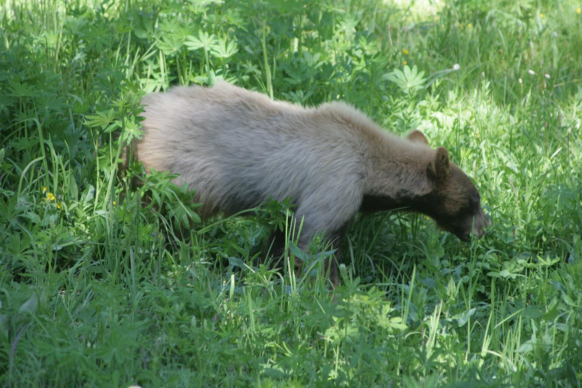 Tatsächlich stand dort ein Bär auf allen Vieren in unmittelbarer Nähe der Straße und fraß Gras. Nun machten die Schilder, die wir vorher mehrfach gesehen hatten Sinn: Speed kills bear. Ich dachte bis dahin, die spinnen ja, wo sollen denn hier die Bären an der Straße sein.... Wir haben beim Eintritt auch eine Parkzeitschrift erhalten und in der steht, dass man normalerweise als Tourist keine Bären sieht, weil diese die Menschen meiden. Wenn man trotzdem welche sieht, soll man ordentlich Krach machen. Und wenn mehrere Personen da sind, sollen sie als wirksamere Abschreckung zusammenstehen. Man soll den Bär nicht umkreisen und einen Mindestabstand von 4 Shuttlebussen halten.... Dieser Bär war aber nur knapp 20 m entfernt. Gut, dass wir die Zeitung erst heute abend gelesen haben. -