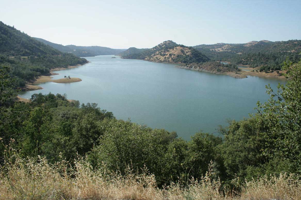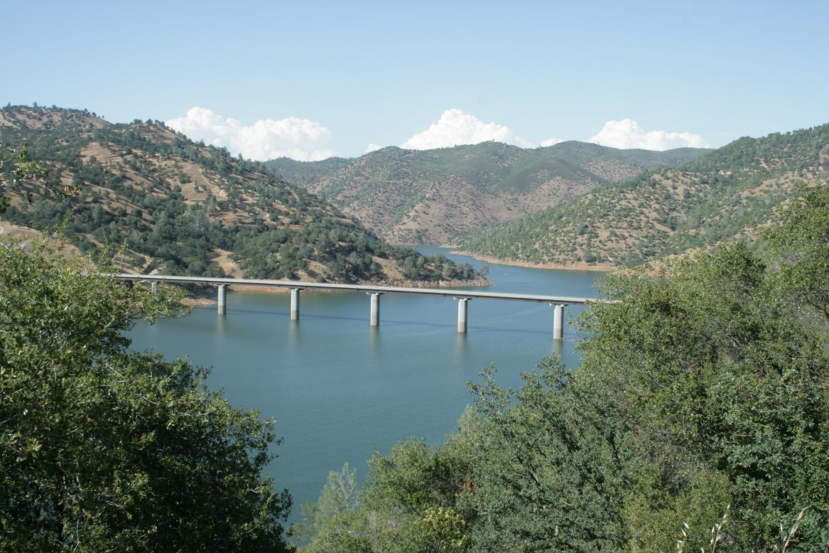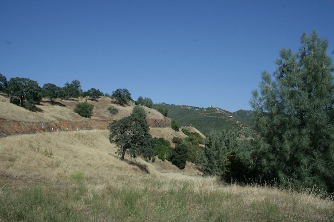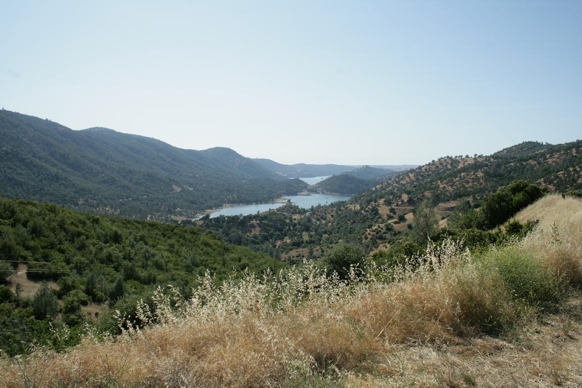 Nun geht es die 120 Richtung Oakdale. Zuerst ist die Landschaft wie zuletzt auf dem Weg zum Park: Nadelbäume, .Dann bekommt sie wieder einen mediteranen Touch. Es geht steil bergab mit scharfen Serpentinen, bei denen man im SItz hin und herfliegt. Plötzlich eröffnet sich ein toller Blick auf den Don Pedro Lake