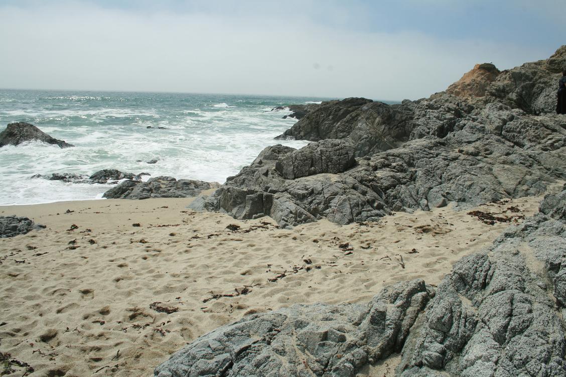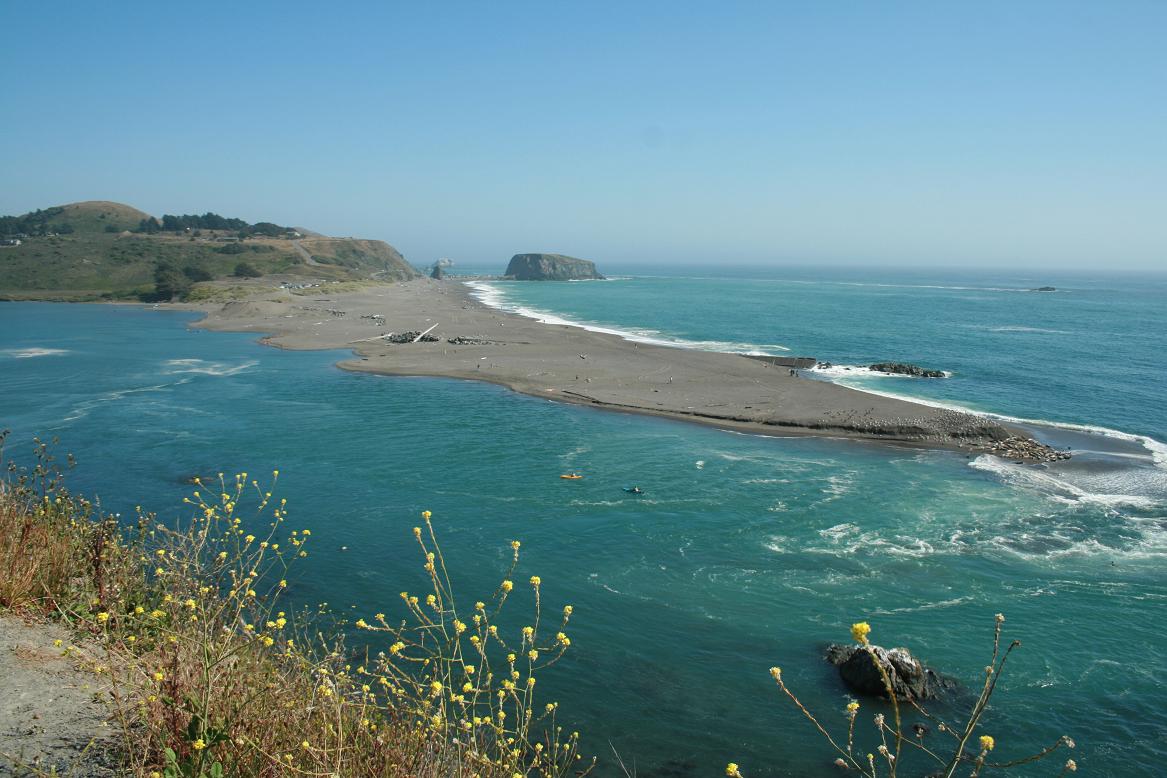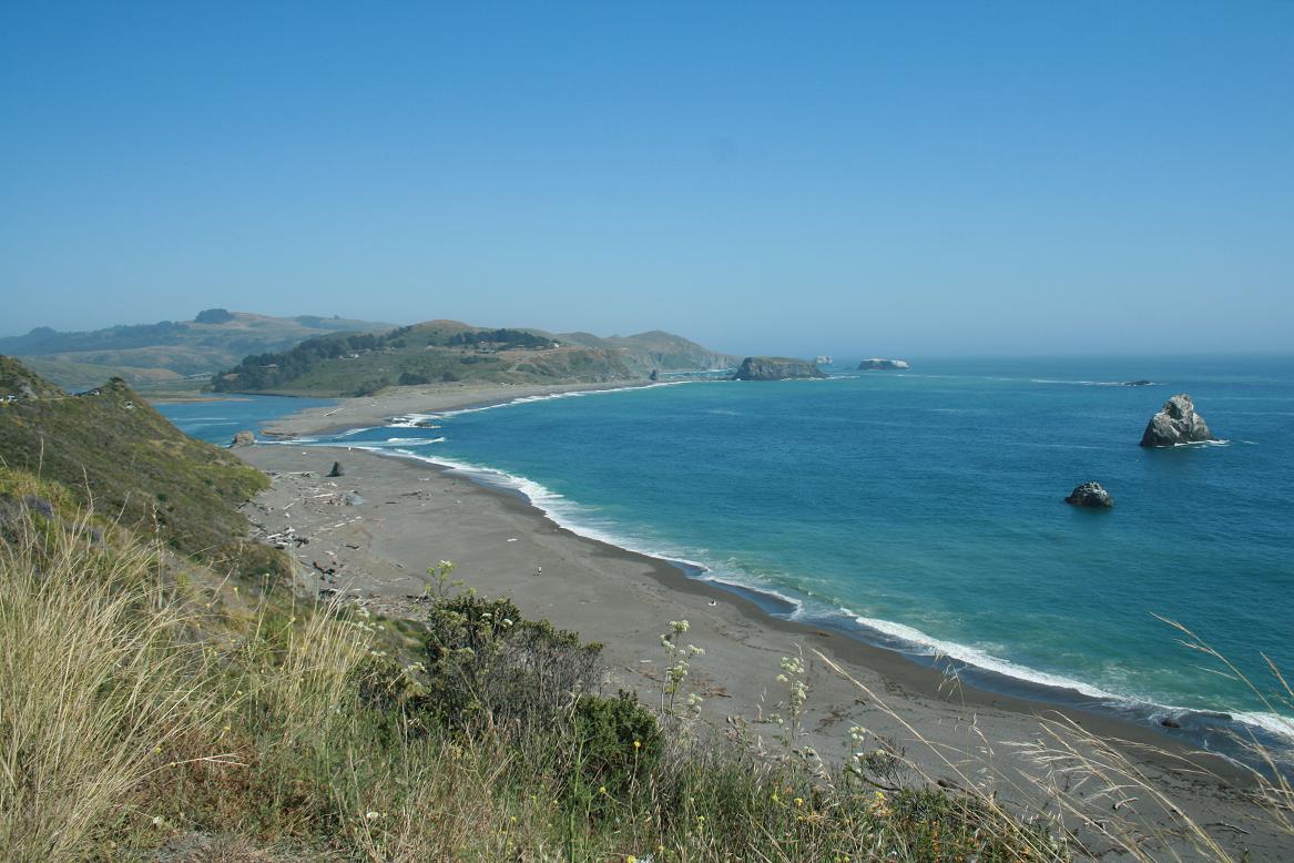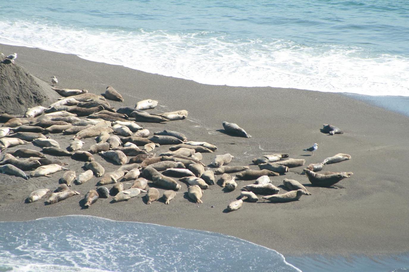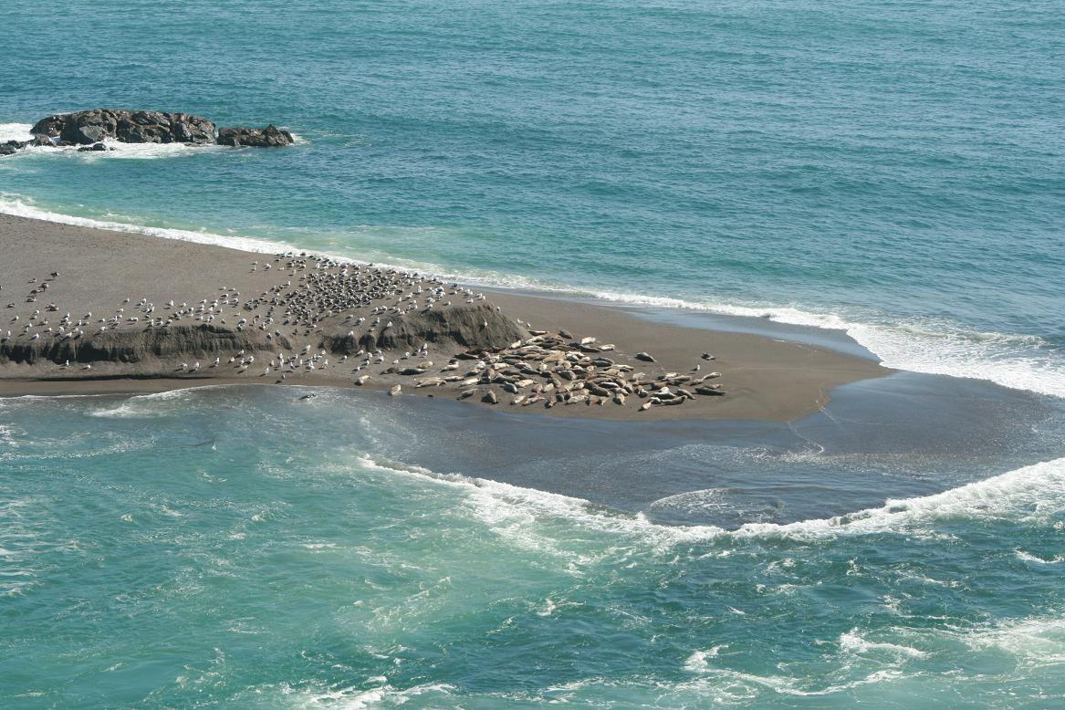 Dann kommen wir zur Bucht vom Russin River bei Jenner. Auch hier eine schöne Sandbucht. Wir stoppen für ein Fotos und erst auf den zweiten Blick sehen wir dann die ganzen Robben, die an der Flussmündung auf einer Sandbank liegen. Auch hier ist wohl der Grund, der Fellwechsel. Beeindruckend.