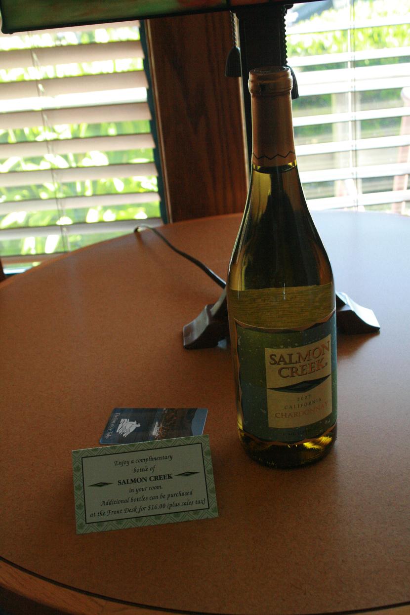 Unser Zimmer 1003 ist in einem Haus höher am Hang und riesengroß. WIr haben zwei riesige kingsize Betten und die ganze Ausstattung ist wirklich schön. Na ja, der Preis war auch nicht ganz ohne, aber hier an der Küste war nichts günstigeres zu bekommen. Wir haben eine Terasse und von dieser sehen wir auch an einigen Stelle, vorbei an den unter uns liegenden Häusern, die Bucht. Es gibt einen großen Swimmingpool. Und eine Flasche edlichen Weißwein als Begrüßung.