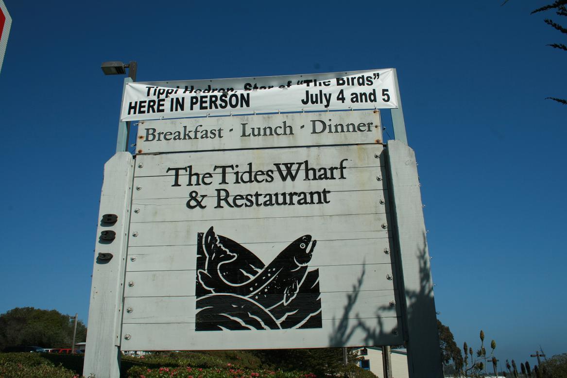 Unser Hotel The Tides of the Inn liegt direkt am Highway 1. Gegenüber ist das Restaurant The Tides Wharf, in dem wir auch unser Frühstück bekommen sollen, und dort wurde HItchcocks Film die Vögel gedreht. Das ursprüngliche Geäude ist allerdings einige Zeit nach den Dreharbeiten abgebrannt. Heute werben sie aber noch damit. Und am 4./5. Juli soll die Hauptdarstellerin hier nächtigen.