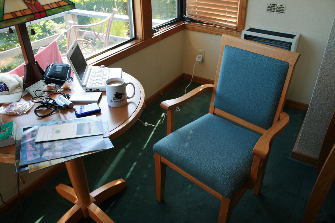 Wir haben schön ausgeschlafen. Jans Fuß war wieder ganz schlecht heute morgen. Deshalb mussten wir zum Frühstück in dem Restaurant auf der anderen Straßenseite mit dem Auto fahren. Als wir unseren Raum verlassen, liegt sogar eine Zeitung vor der Tür. So lässt es sich leben....