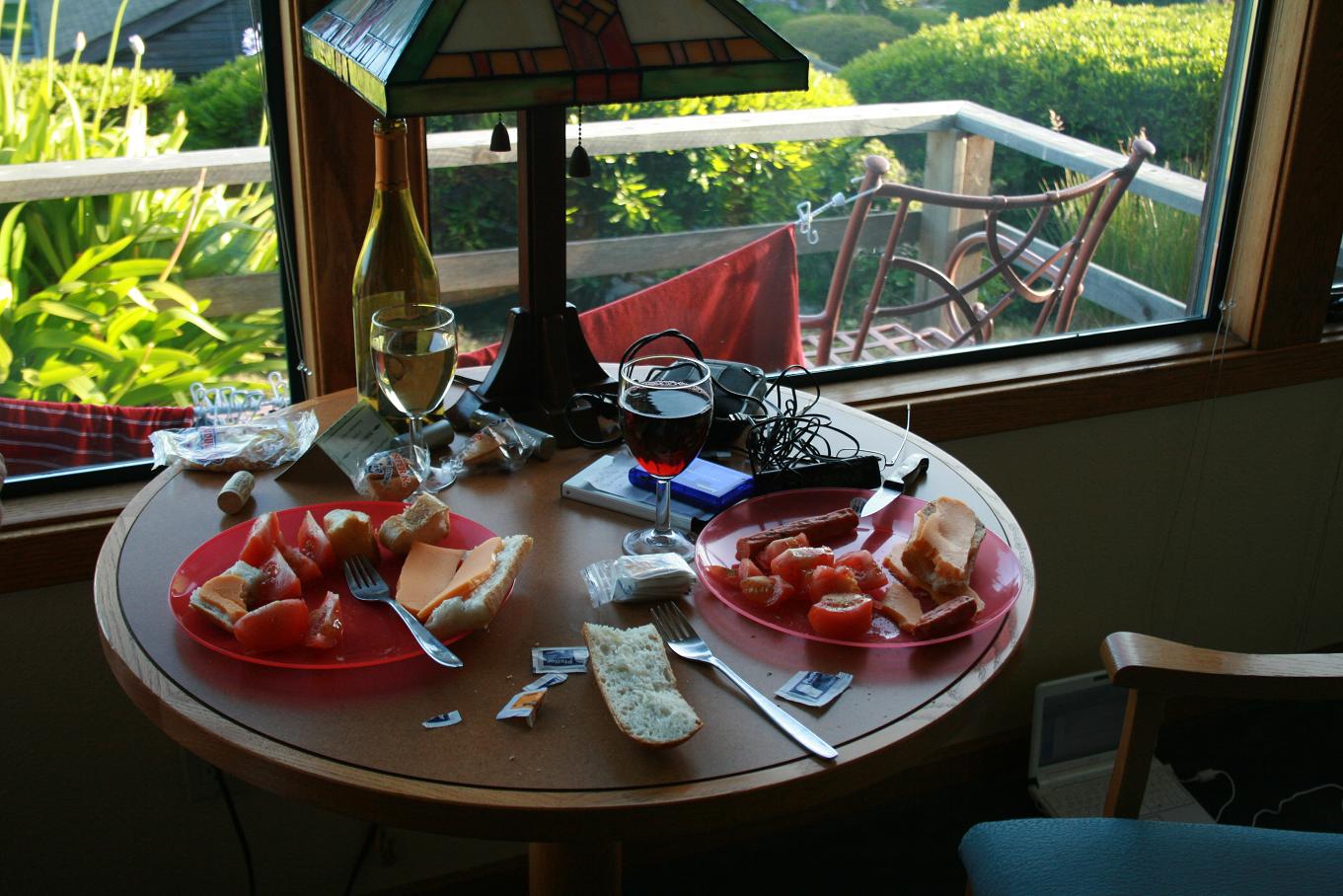 Den Tag beenden wir mitt chips and calamaris bzw. chips and prawns. Dann machen wir es uns auf der Terasse gemütlich, bis es zu kalt wird, und trinken ein Glas von dem Weißwein - für morgen lassen wir uns noch was über – und danach von unserem kalifornischen Rotwein von safeway, corbett canyon cabernet sauvignon. Lecker. -