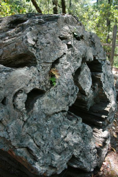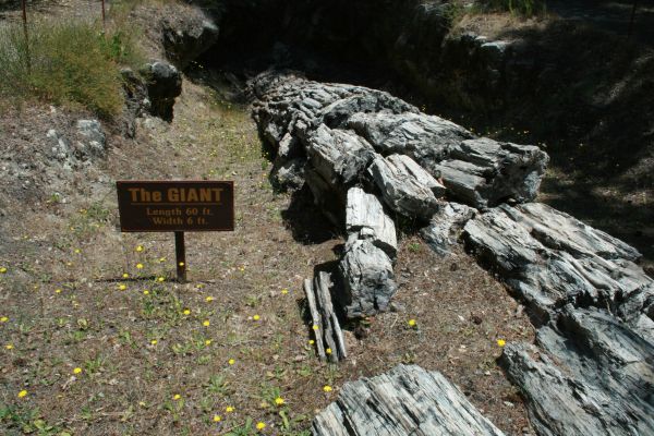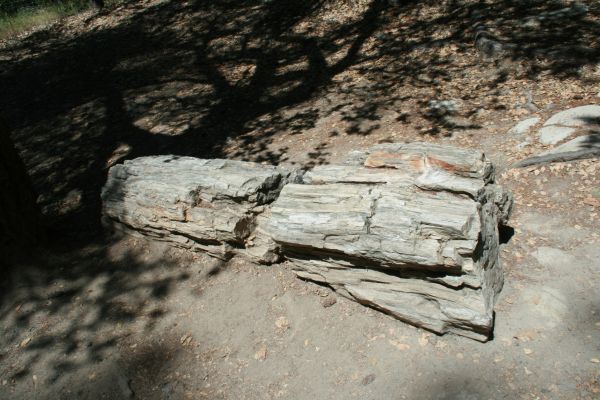 Vor über 3 Millionen Jahren brach in 7 Meilen nordöstlich von dieser Stelle ein Vulkan aus. Der Vulkanausbruch brachte die Redwoods zum Umstürzen. Die Bäume wurden von der Asche begraben und unter der Asche versteinerten sie. Mit Silikaten aus der Asche angereichertes Wasser sickerte langesam in die Spalten ab, die von den zersetzen Holzfasern zurückgelassen wurden: Es wurde das Holz Zelle für Zelle durch kristallisierte Kieselerde ersetzt bis der ganze Baum Stein geworden ist.