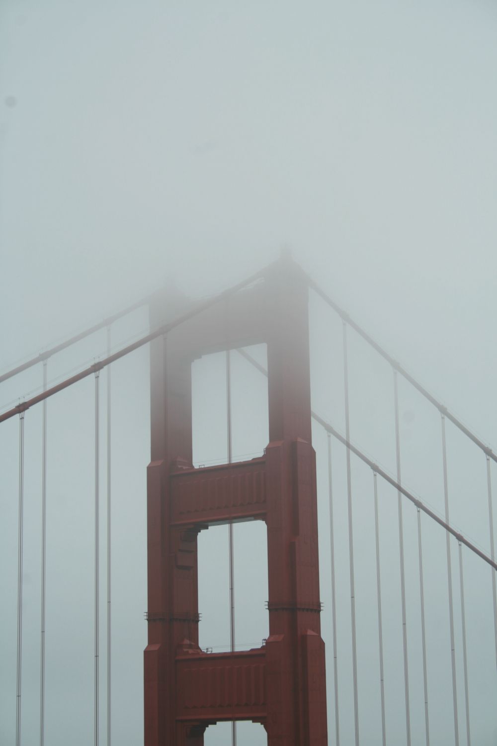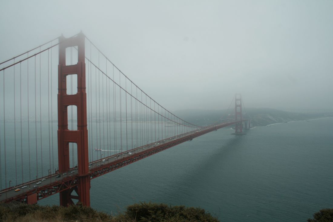Zunächst fahren wir noch nicht über die Brücke, sondern kreuzen die 101 und halten dann am Aussichtspunkt neben der 101 mit Blick auf Brücke und San Francisco. Die Brücke ist mal wieder im Dunst, und nur teilweise zu sehen. Beim Ausssteigen fegt uns ein heftiger Wind um die Ohren. Es ist echt ungemütlich, aber hilft nichts – wir müssen rauf auf den Hügel und schießen Nebelbilder von der Brücke. -