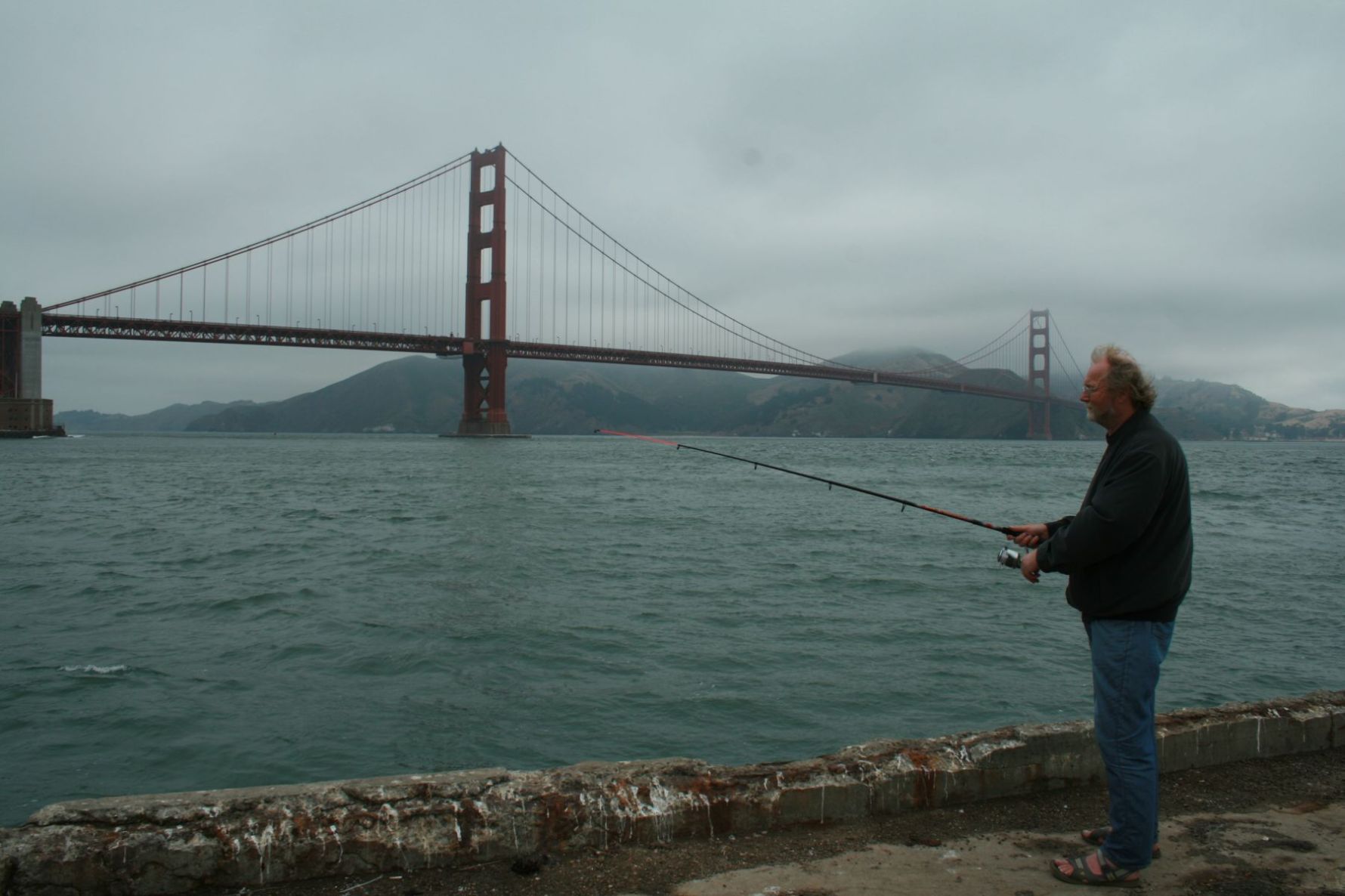 Auf der anderen Seite der Brücke fahren wir zum Pier, der beim Marine Drive liegt. Es ist weiterhin ungemütlich dort, auch wenn in downtown die Sonne scheint. Jan wollte wenigstens einmal im Pacific, hier San Francisco Bay, angeln. Ich habe mich mit einem Buch eine einigermaßen geschützte Stelle zurückgezogen, während Jan angelte. Er war genauso erfolgreich wie die einheimischen Angler... -