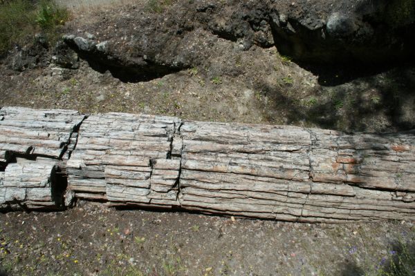 Vor über 3 Millionen Jahren brach in 7 Meilen nordöstlich von dieser Stelle ein Vulkan aus. Der Vulkanausbruch brachte die Redwoods zum Umstürzen. Die Bäume wurden von der Asche begraben und unter der Asche versteinerten sie. Mit Silikaten aus der Asche angereichertes Wasser sickerte langesam in die Spalten ab, die von den zersetzen Holzfasern zurückgelassen wurden: Es wurde das Holz Zelle für Zelle durch kristallisierte Kieselerde ersetzt bis der ganze Baum Stein geworden ist.