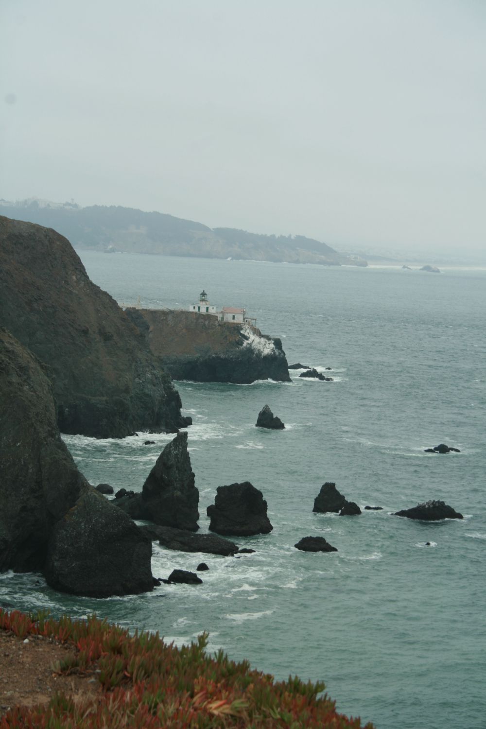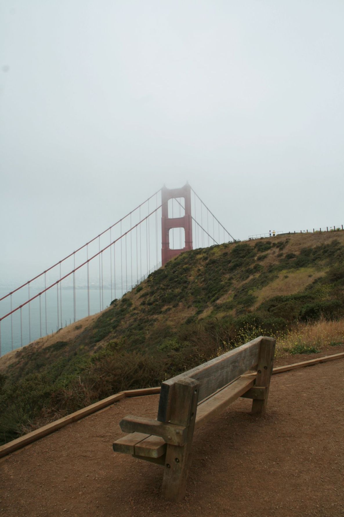Zunächst fahren wir noch nicht über die Brücke, sondern kreuzen die 101 und halten dann am Aussichtspunkt neben der 101 mit Blick auf Brücke und San Francisco. Die Brücke ist mal wieder im Dunst, und nur teilweise zu sehen. Beim Ausssteigen fegt uns ein heftiger Wind um die Ohren. Es ist echt ungemütlich, aber hilft nichts – wir müssen rauf auf den Hügel und schießen Nebelbilder von der Brücke. -