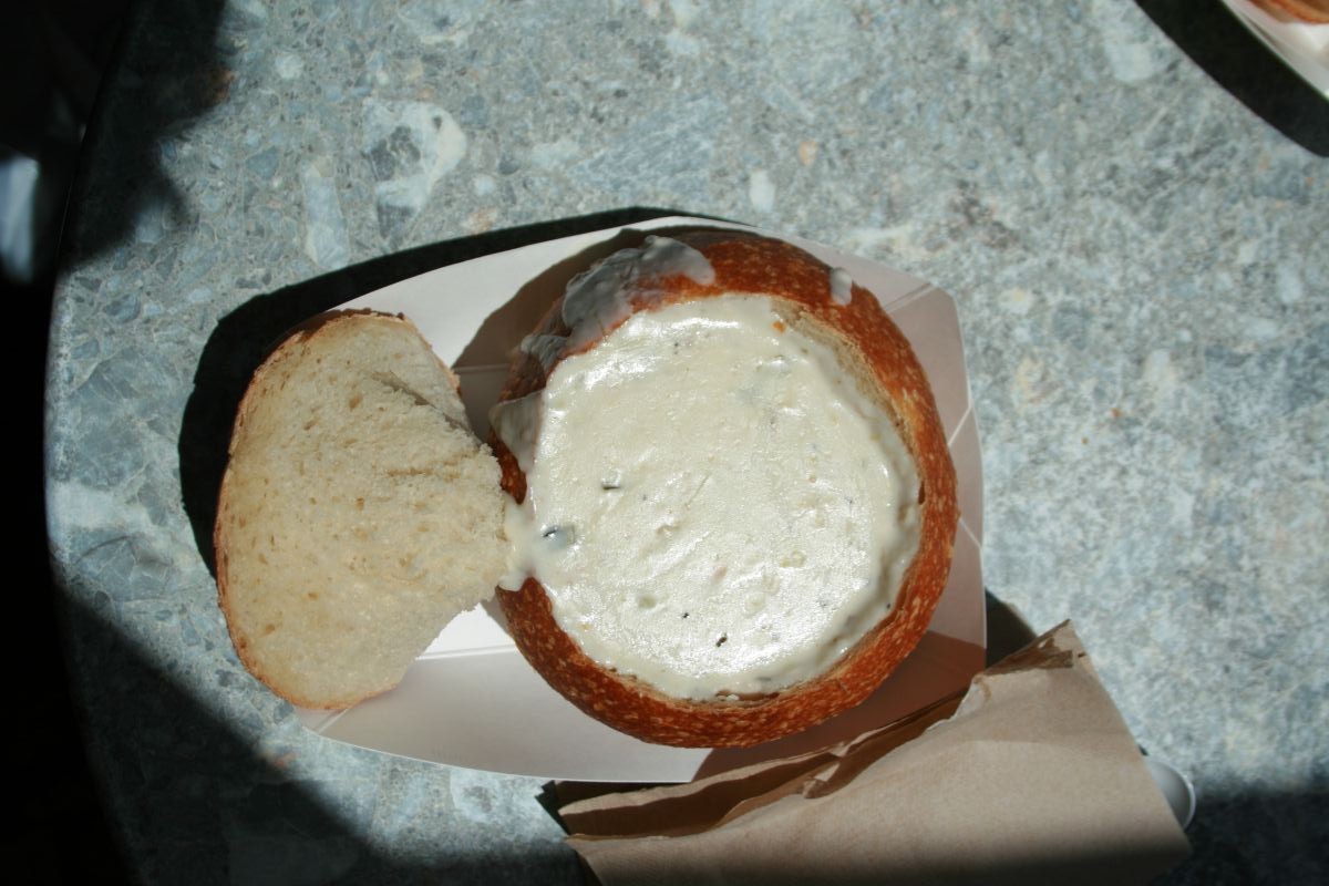 Wir entdecken wieder neue Sachen, die wir bei unseren Rundgängen zuvor nicht gesehen haben. Und ich esse noch einmal weißen Clumchowder in Brot – sehr lecker – und Jan ein dickes Krabbensalatbrötchen