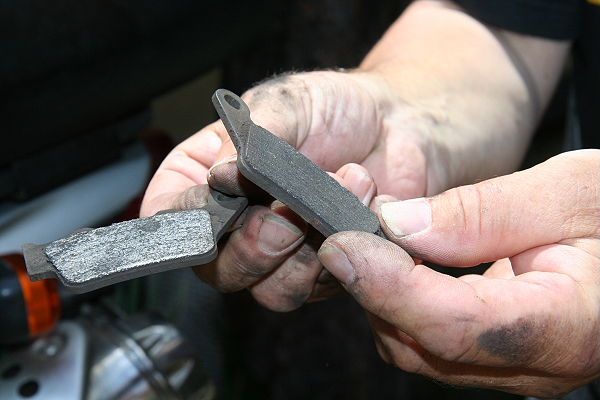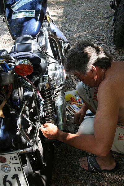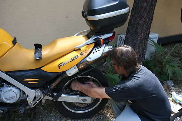 Es ist Samstag der 27.6., Friedrich und Dieter wechselten die Bremsklötze am Hinterrad aus. Mit mehr oder weniger Fluchereien, denn das meiste Werkzeug ist bei Friedrichs XS 650 SE und die ist ja bekanntlich schon ohne uns nach Hause gefahren.