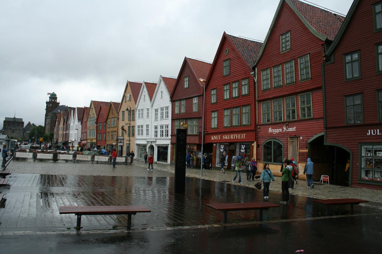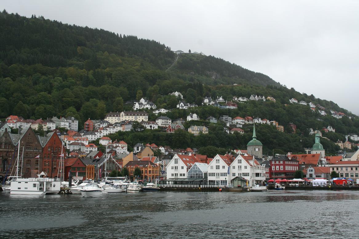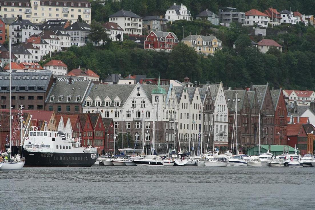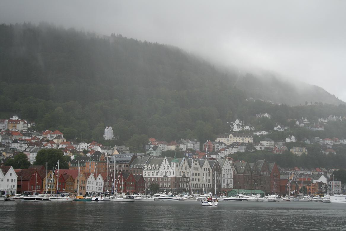 Bergen liegt im südlichen Teil von Norwegen, und zwar im Fjordnorwegen, und ist bereits mehr als 900 Jahre alt. Mit rund 240.000 Einwohnern ist es die zeitgrößte Stadt Norwegens. Es liegt wunderschön dem Meer zugesandt und die Häuser verteilen sich auf Hängen.Im Mittelalter war Bergen Mitglied der Hanse und Sitz eines Hansekontors, aber keine Hansestadt. Dummerweise ist Bergen auch die regenreichste Stadt Europas, und das haben wir am letzten Wochenende deutlich gemerkt.