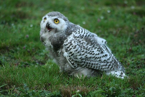 Die Schneeeulen, es sind 3 Stück, sind allerliebst und noch sehr jung. Später, wenn sie erwachsen sind, dann werden sie natürlich weiß. Sie sind von den Falknern aufgezogen und schreien daher noch viel nach "Mama"...