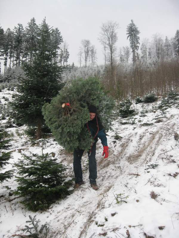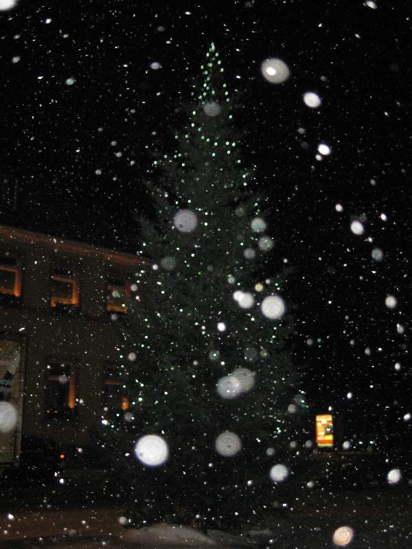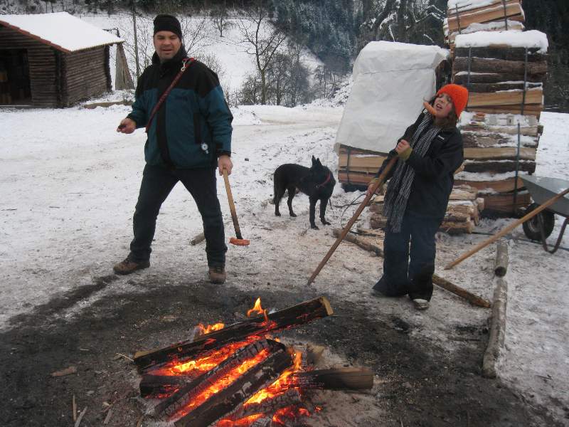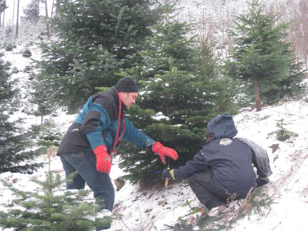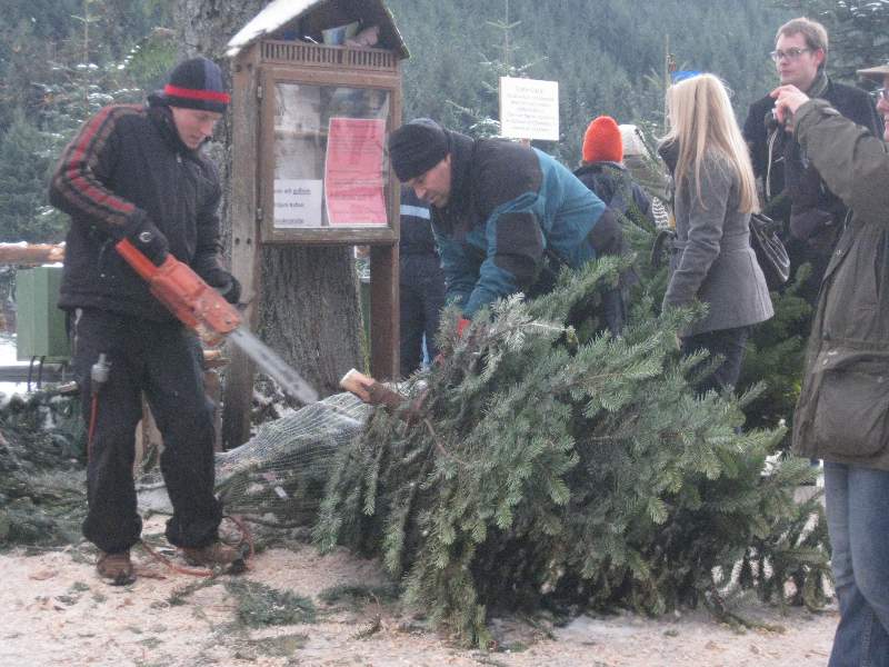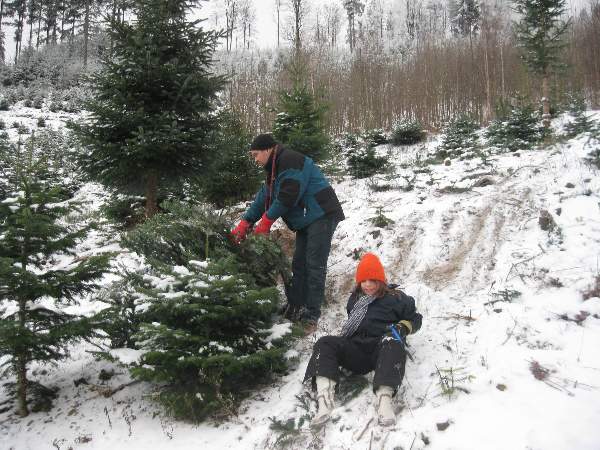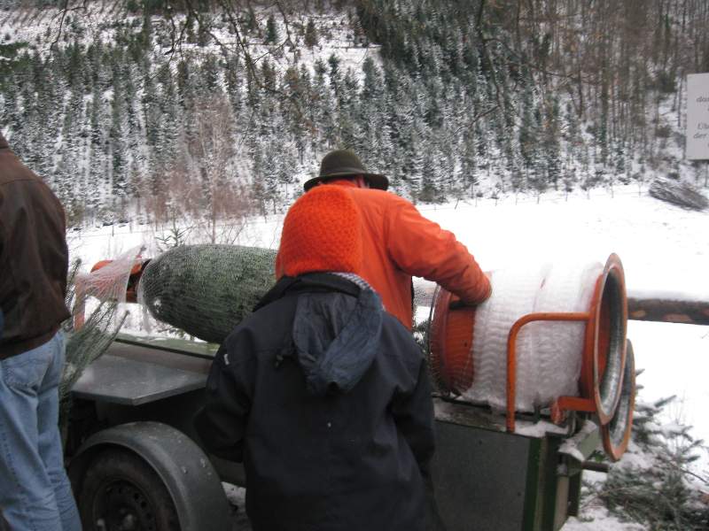Wenn ihr alle ein Feuerlein habt, wollen wir auch.... Vorher mußten wir aber "arbeiten"! Wir sind in den für Wein berühmten Nachbarort Durbach und dort noch ins " Gebirg" gefahren, um uns unseren Weihnachtsbaum auszusuchen, abzusägen und mühevoll abzutransportieren! Zur Belohnung gabs Glühwein und Würstchen vom Feuer, zum Abschluß noch nach Rammersweier (auch Weinort), dort war "Singen unterm Weihnachtsbaum". Da Laura im Kinderchor ist, gehört das zum "Pflichtprogramm" und so sind wir schon gut durchgefroren weiter, um bei Schneesturm dann leider nicht unter dem wEIHNACHTSBAUM ZU STEHEN; sondern in der Abfüllhalle der Weinkellerei! Dort wars zwar nicht romantisch, aber wenigstens nicht gar so kalt und der zweite Glühwein des Tages hat trotzdem geschmeckt! Der arme Tannenbaum draussen, war leider verwaist...