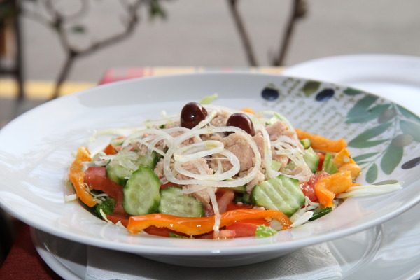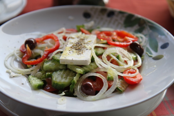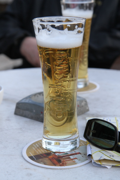 Wir setzen uns draußen in ein Cafe und essen eine Kleinigkeit, bevor wir weiterfahren.