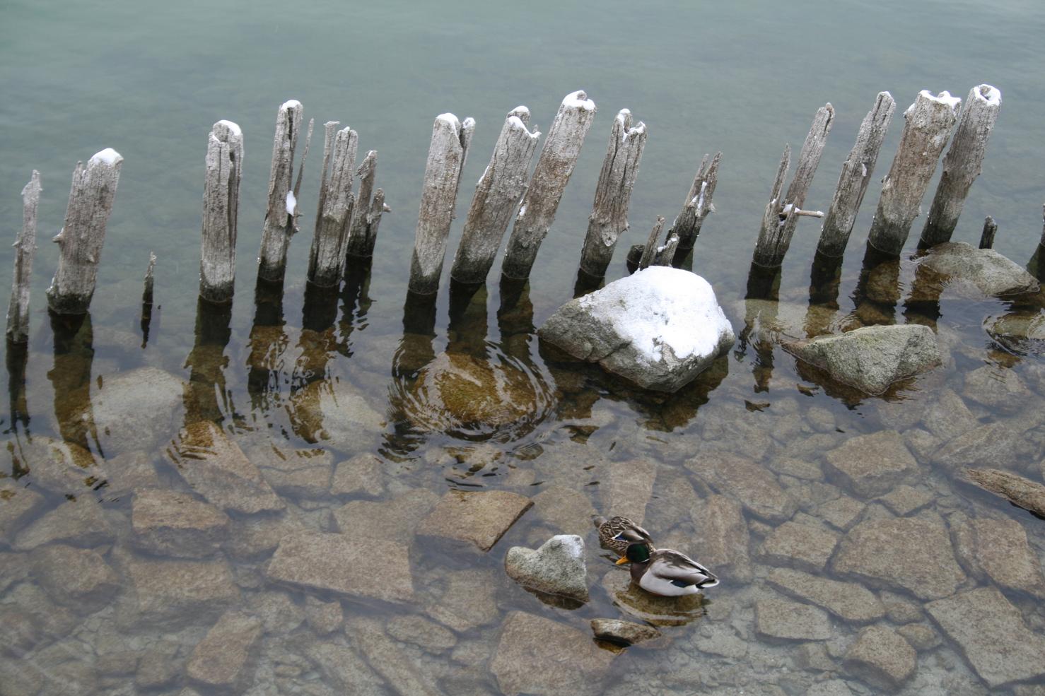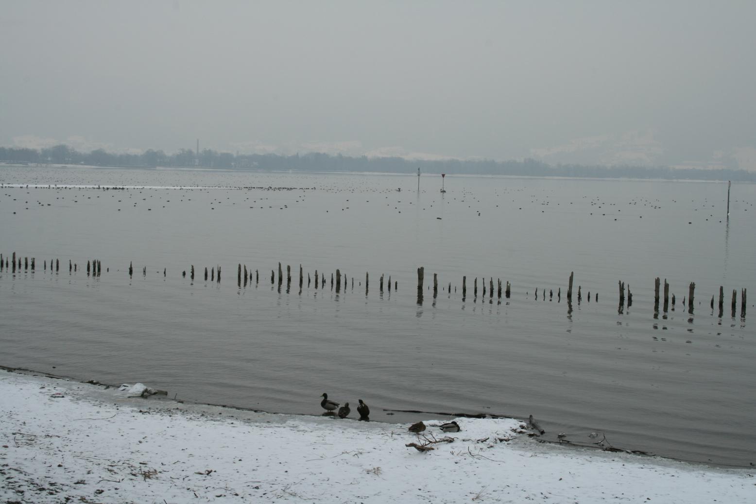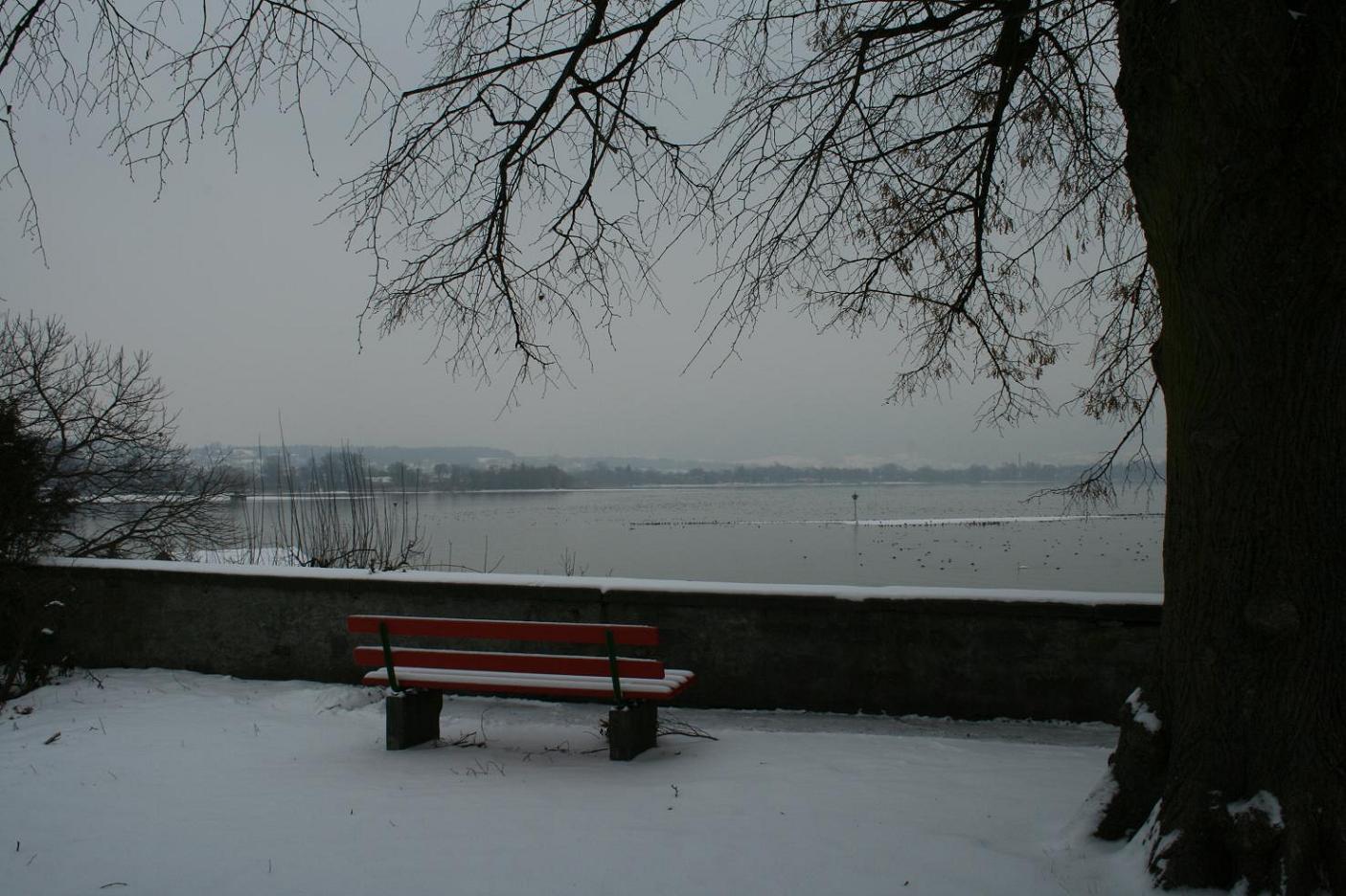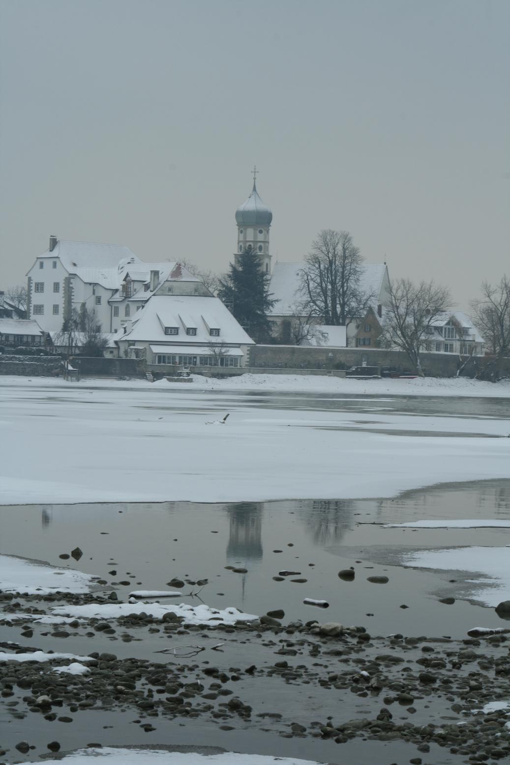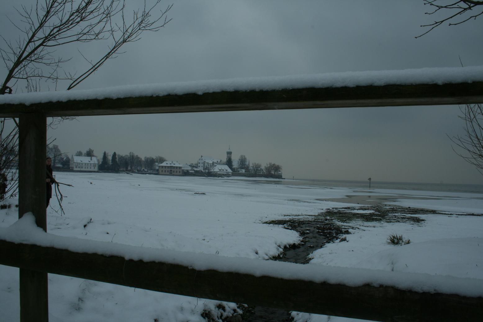Dann geht es weiter nach Wasserburg. Im Reiseführer gab es einen Blick über den See auf die Kirche. Den wollen wir auch fotografieren. Doch die Stelle ist nicht einfach zu finden. Zwar finden wir einen Parkplatz in der Nähe der Kirche, aber da bekommen wir nicht den gewünschten Blick. Also folgen wir einem verschneiten Weg durch ein Naturschutzgebiet, bis wir der Kirche gegenüber und am Seeufer stehen