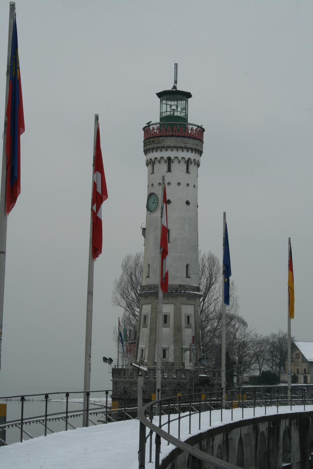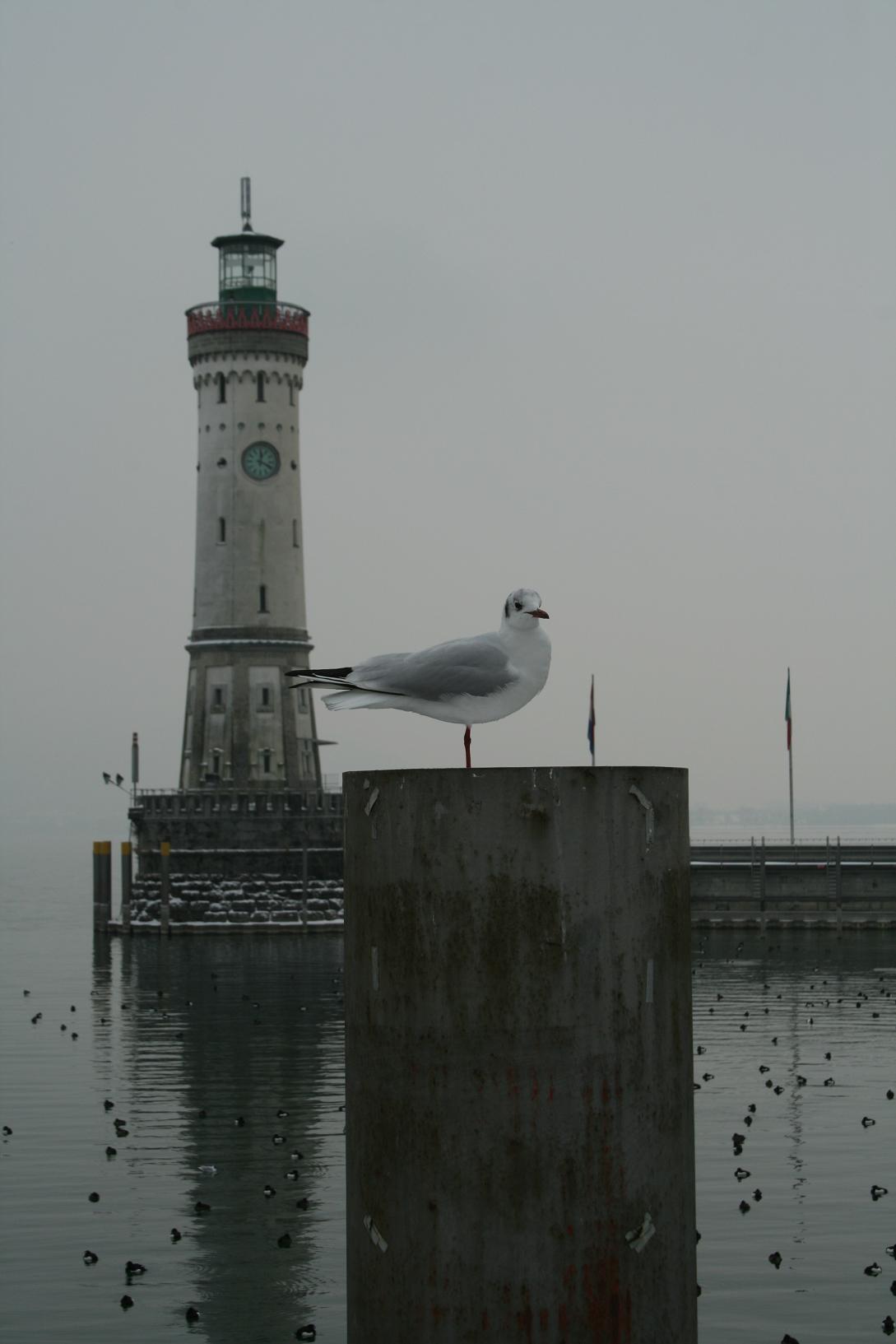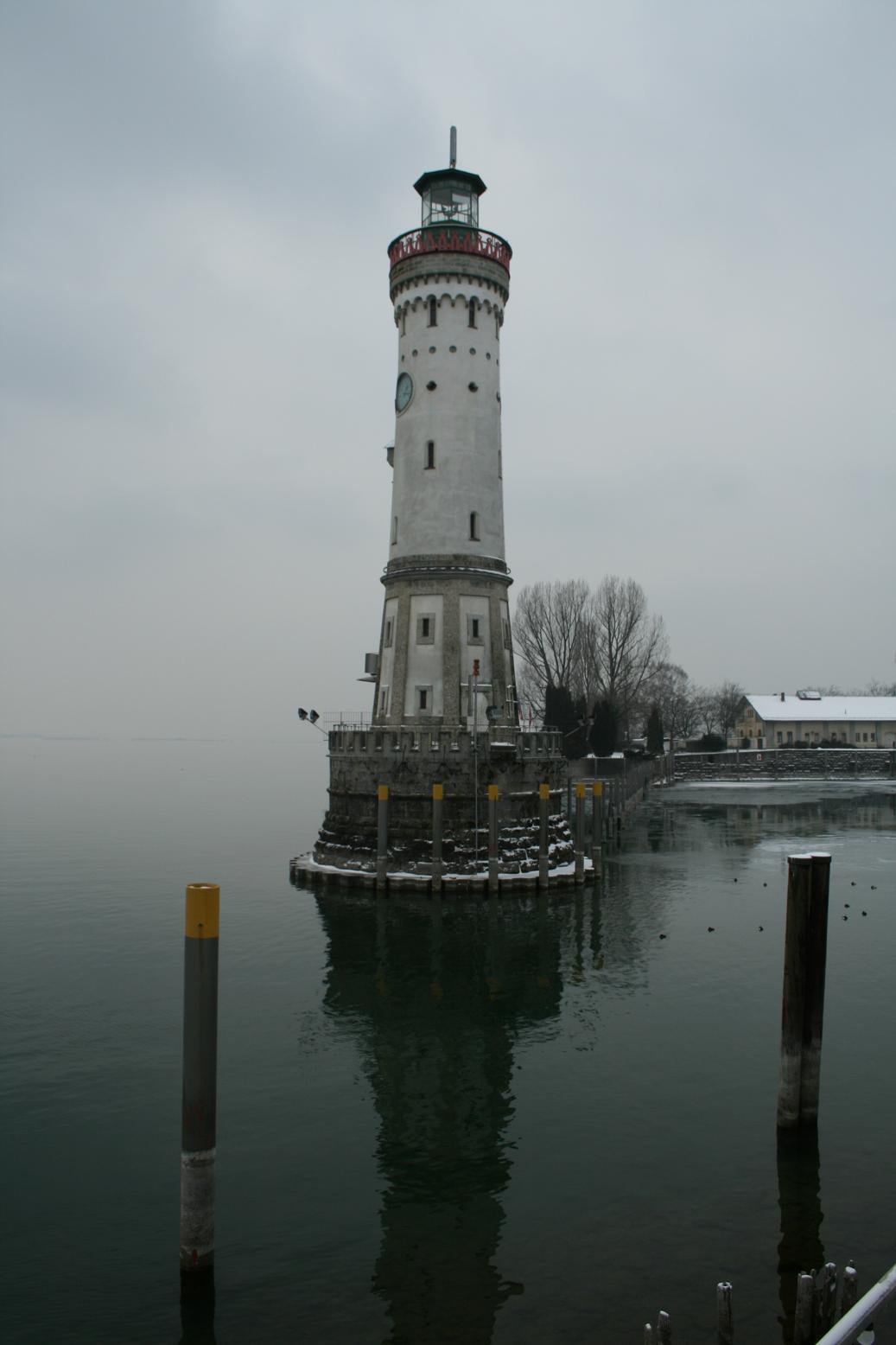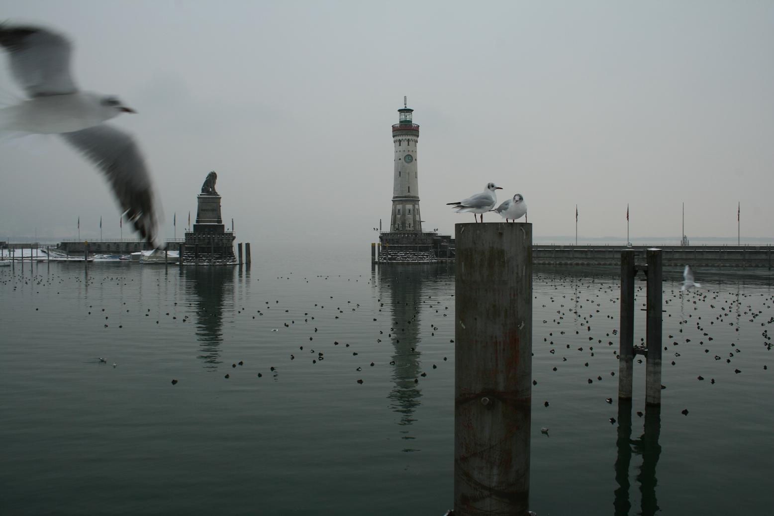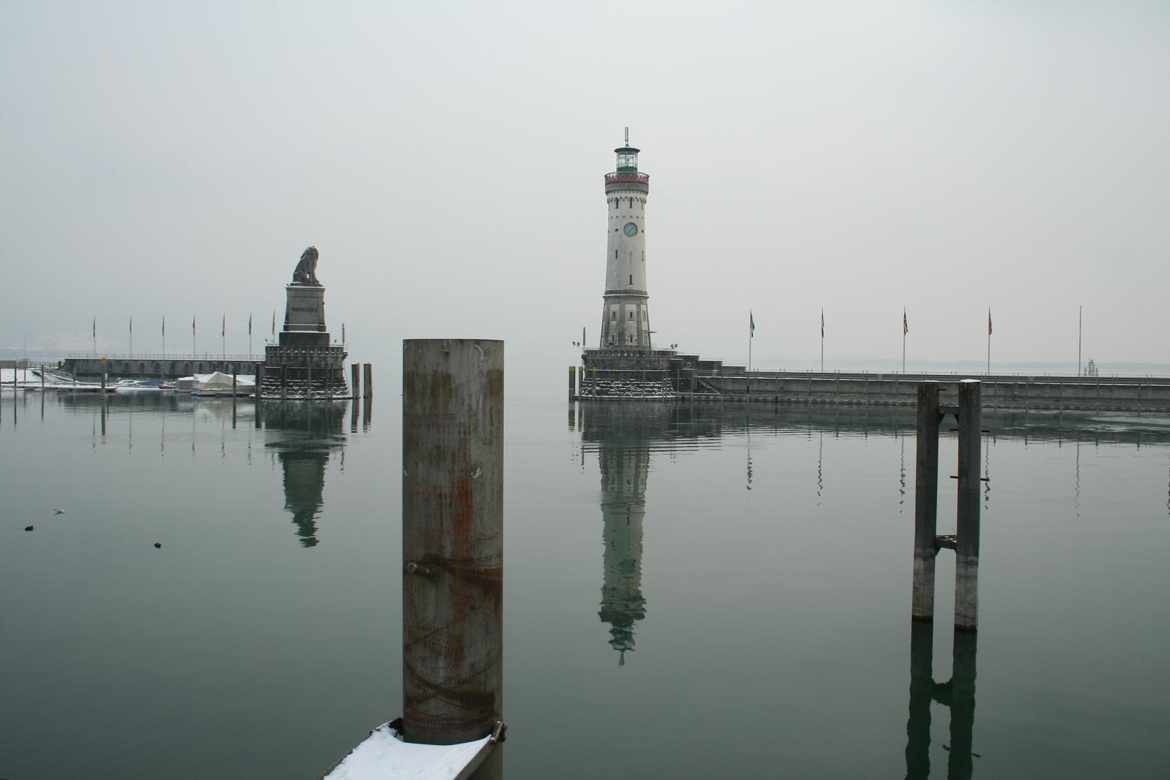 An der Einfahrt zum Hafen steht der "neue" Leuchtturm von 1856 auf der Westseite und ein Bayrischer Löwe auf der Ostseite.