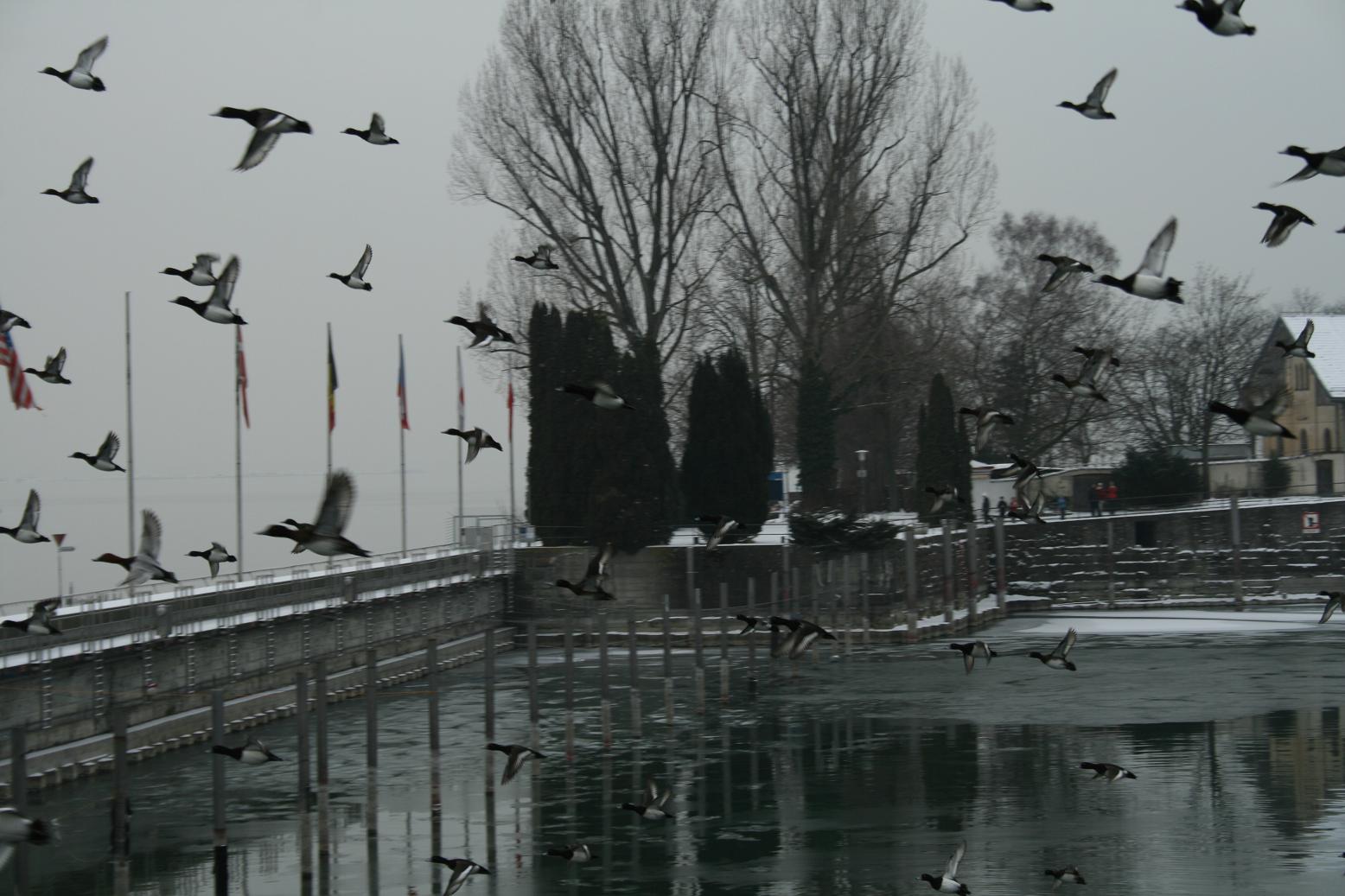 Im Hafenbecken sind jede Menge Vögel, die plötzlich in mehreren Schwärmen aufbrechen -