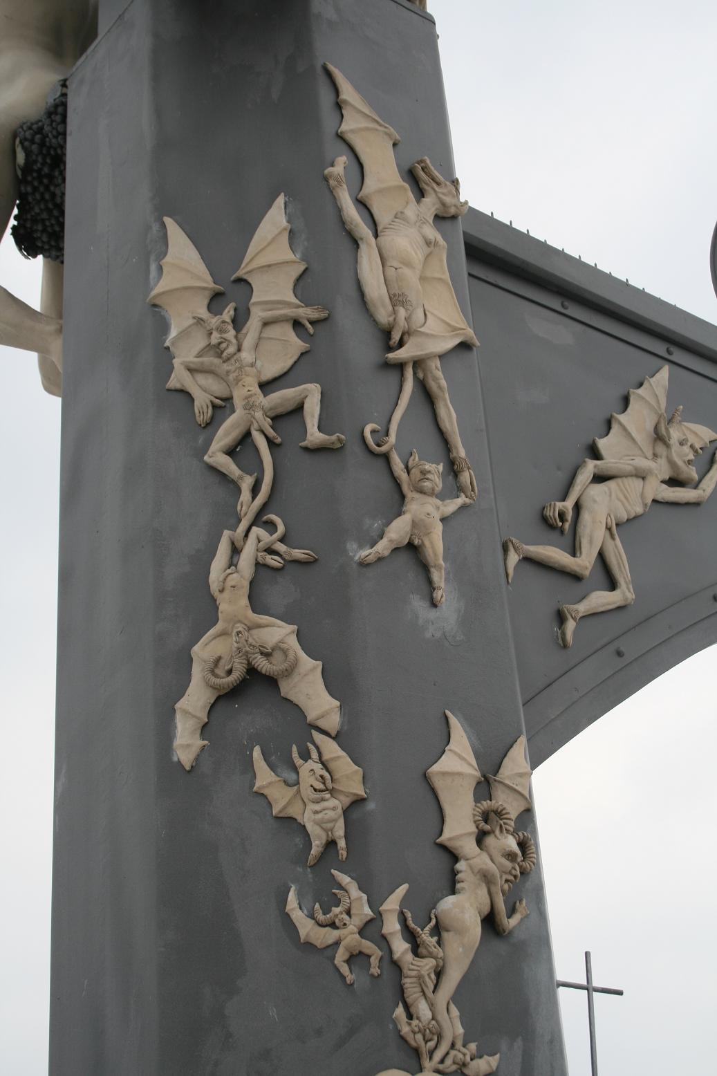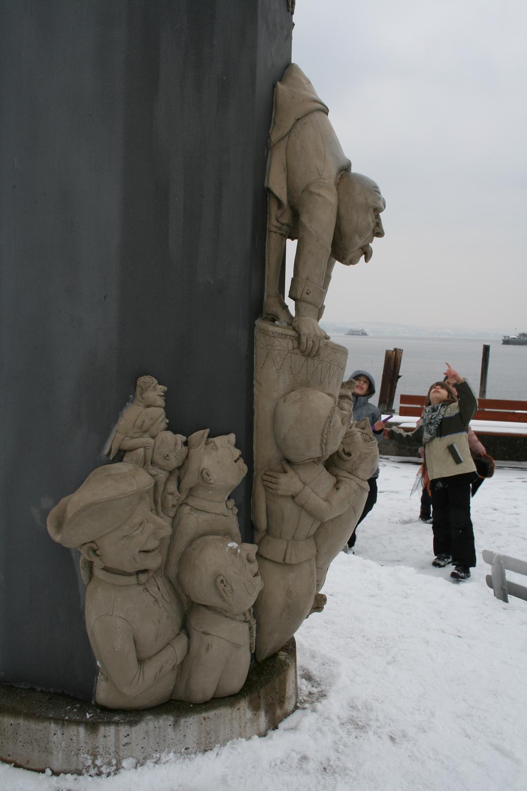 Am Hafen steht die magische Säule.Das doch recht besondere Kunstwerk des Bildhauers Peter Lenk zeigt satirische Portraits bekannter Persönlichkeiten aus der Meersburger Stadtgeschichte und verdeutlicht deren Wirken anhand ihrer Darstellung.