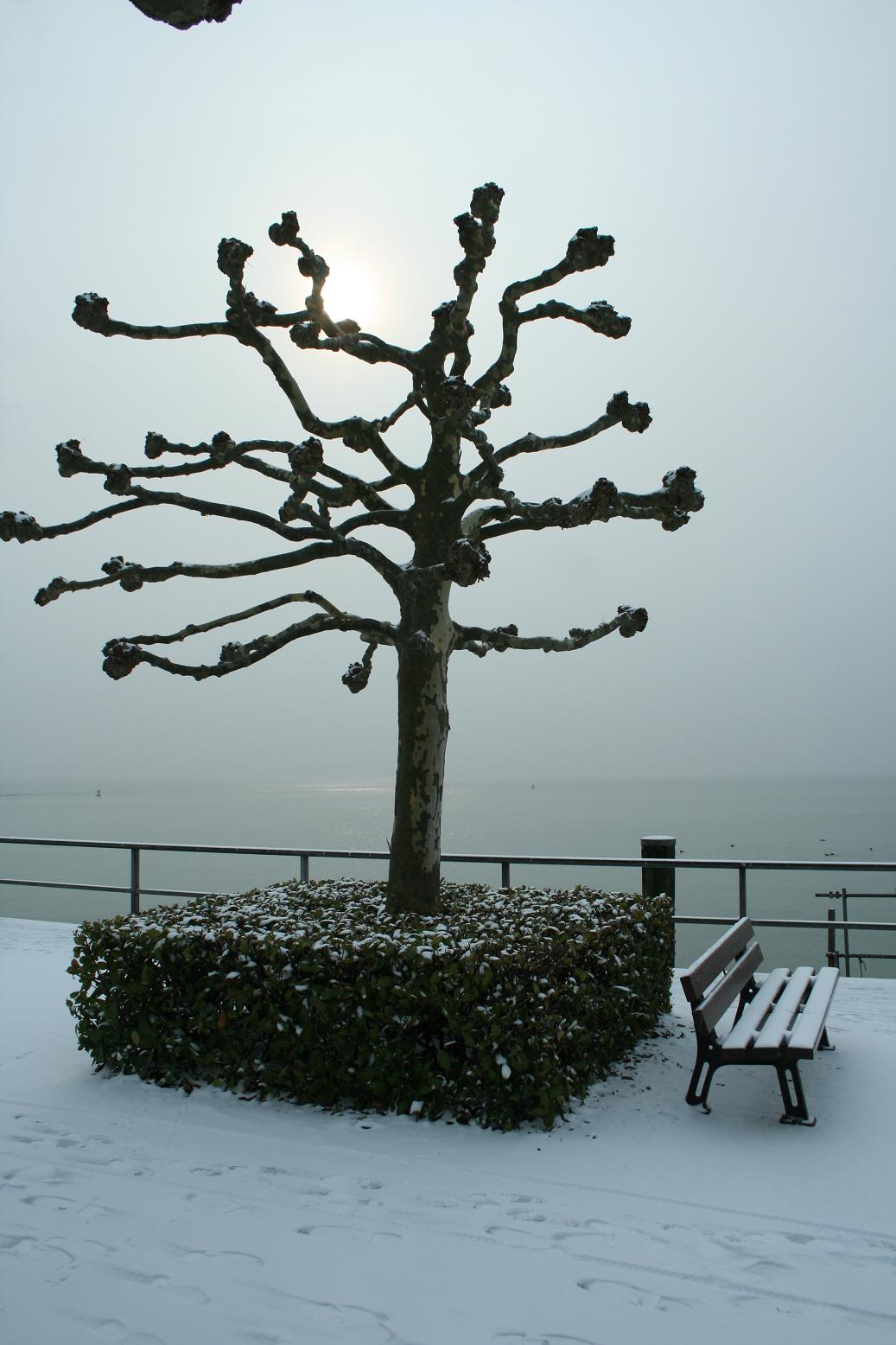 Dann sollte es nach Meersburg zurück gehen, kuzfristig entschließen wir uns aber zu den Rheinfällen nach Schaffhausen zu fahren. Die hat von uns bisher auch keiner gesehen. Gesagt getan... auch hier gibt es die bekannten Schlecht-Wetter-Bilder.... Oder "Spezialgrau".Danach haben wir keine Lust mehr und fahren die 85 km zurück nach Friedrichshafen. Unterwegs schneit und schneit es....