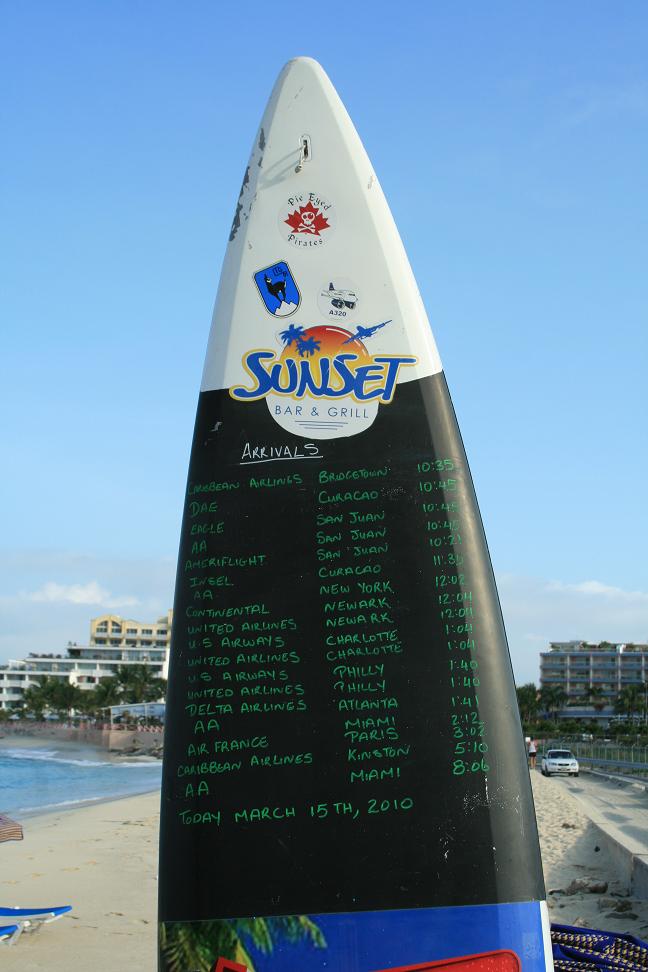 Rechts und links am Strand sind Bars. Und bei der einen hört man den Funkverkehr und auf einem Surfbrett sind die Zeiten der ankommenden Maschinen aufgeschrieben.