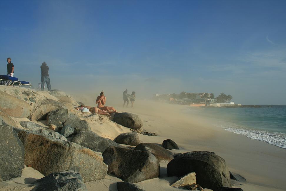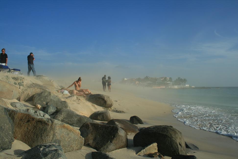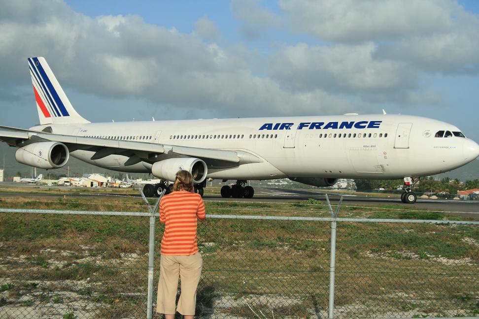 Und dann kommt die Air France, Airbus A 340, herangerollt. Okke steht Auge in Auge mit ihr...., sie dreht sich und steht nun in Startposition. Wir gehen in Deckung, die meisten anderen auch, zum Teil hinter Autos. Zwei unge Mädchen, auch noch oben ohne (da prickelt der Sand besonders schön auf der Haut) liegen offensichtlich ahnungslos am Strand. Und dann startet die Maschine durch und ein Wüstensturm fegt über uns hinweg. Ich schieße schnell Fotos und wickel dann die Kamera in mein Kleid