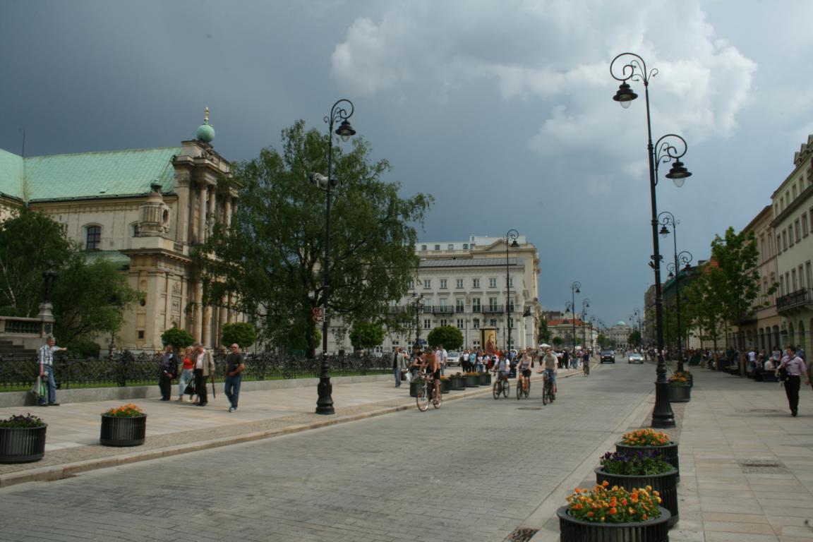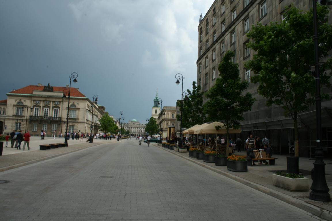 Gegen 15.30 zieht der Himmel zu und es grummelt.Wir gehen daher zurück zum Hostel, und zwar die Krakowskie Prezedmiesvie - Krakauer Vorstadt- entlang. Es ist eine breite Straße und auch hier, heute am Sonnabend, kein AUtoverkehr. Das macht eine tolle Stimmung. -