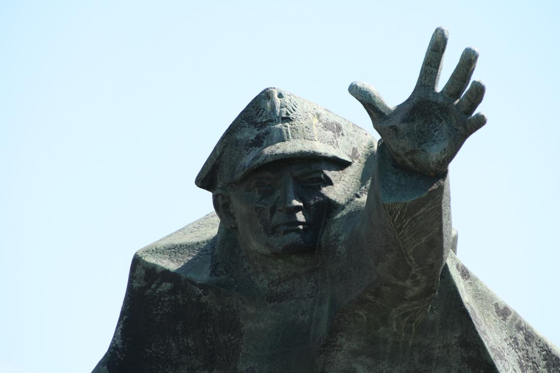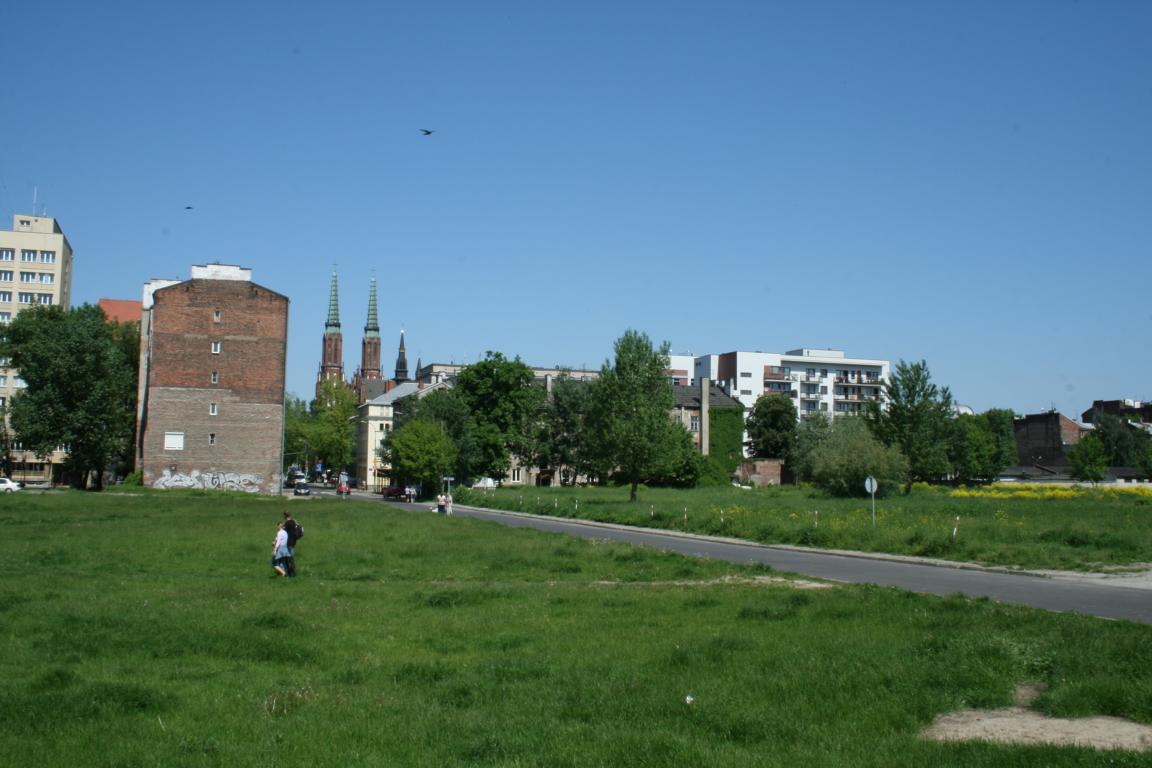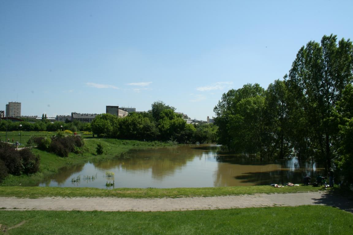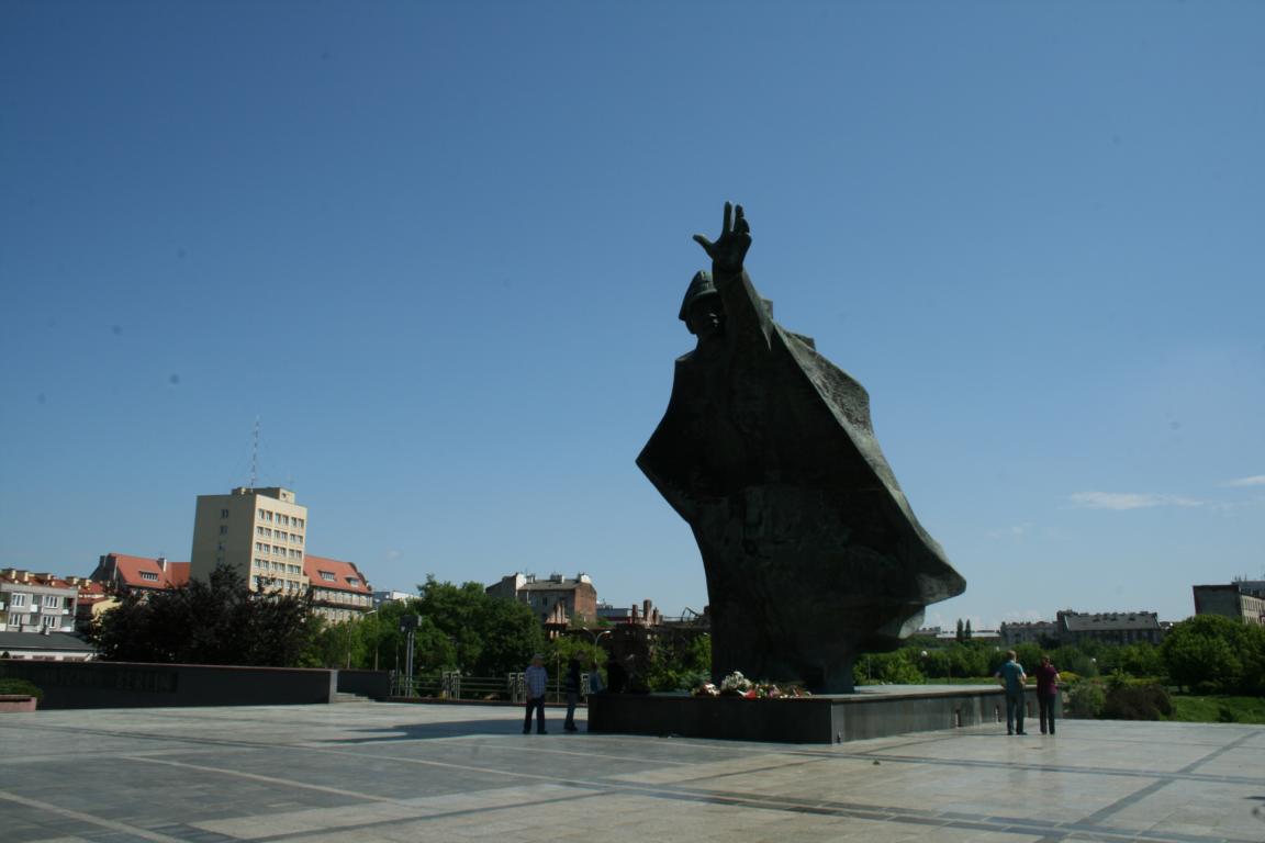 Wir kommen an einem weiteren Monument vorbei. Dahinter breitet sich die Weichsel bzw. ein Nebenarm in die Grünanlagen aus. Und mitten in der Stadt Brachland