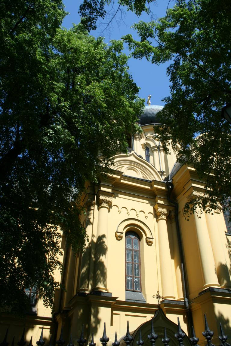 Wir kommen an einer schönen orthodoxen Kirche vorbei - Fotografieren schwierig, weil hohe Bäume rundherum stehen. Hineinschauen unmöglich, weil Pfingsgottesdienst ist, und die Menschen schon draußen stehen und zuhören.