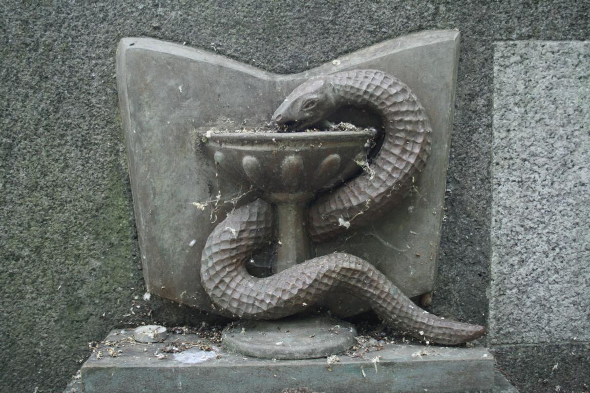 Im 20. Jahrhundert kann man auf dem Grab eines Arztes auch den Äskulapstab finden, einen von einer Schlange umwundenen Stab als Symbol für den Arztberuf. -