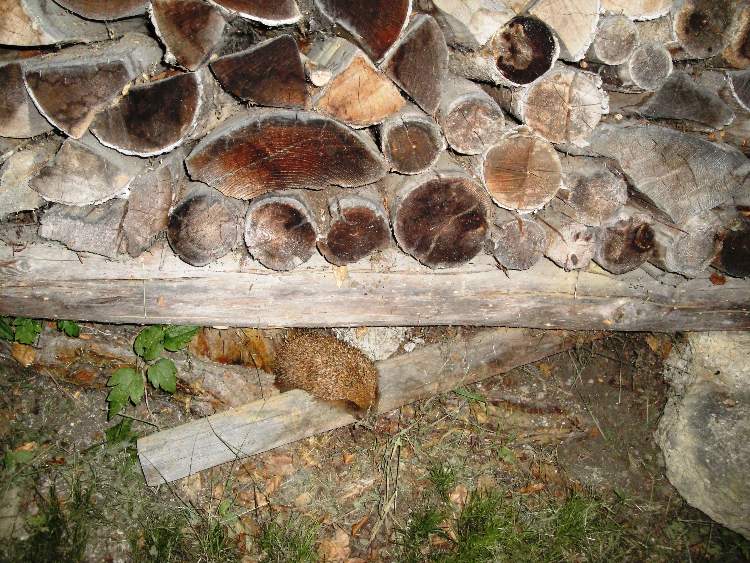 Hab ihn gestreichelt und fotografiert, dann verrollte er sich wieder hinter den Holzstoß, den wir gerade wegschneiden. ![]()