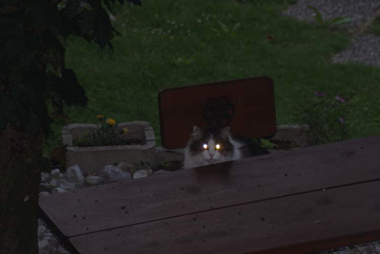 Plötzlich ein Sprung und die Katze sas am Sessel daneben aber so irrsinnig schnell konnte ich gar nicht abdrücken und der kleine Besucher war schon am Baum und schimpfte, schnell hochkletternd, die ganze Zeit.
