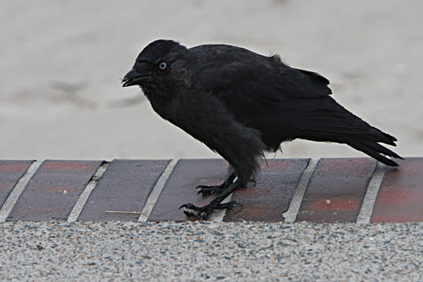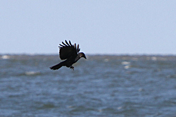Während Maria ihr Eis schleckt, baue ich wieder mein Stativ auf und erwische eine Dohle, die in der Nähe am Strand herumfliegt.