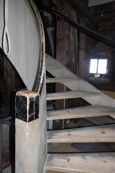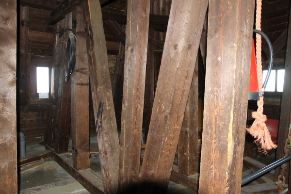 Oben im 7. Stock angekommen schließen wir eine schwere Eisentür auf, die wir gleich hinter uns wieder abschließen. Wow, wir befinden uns unter einer Holzkonstruktion. Nun führt eine Wendeltreppe ind die Spitze des Turmes.