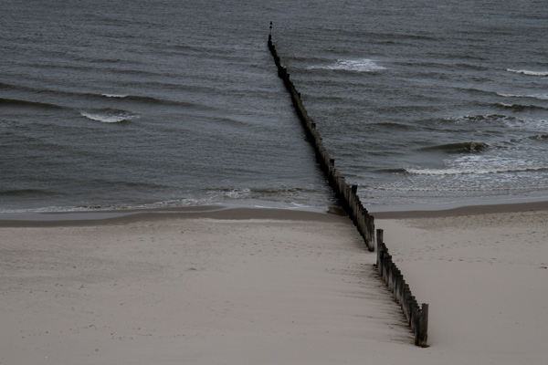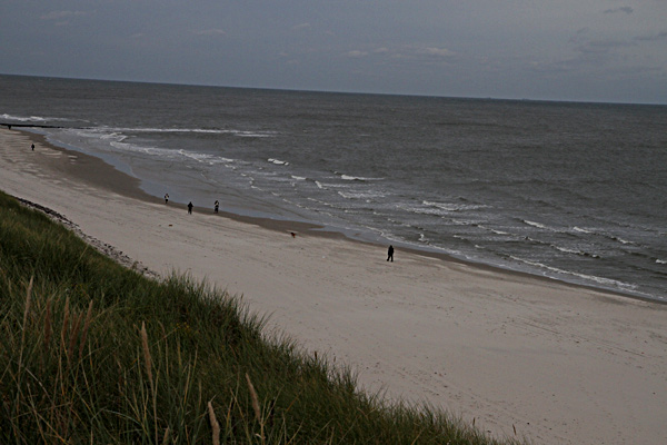 Wir fahren bis zum Aussichtspunkt, stellen unten unsere Fahrräder ab und klettern auf die Düne. Von dort haben wir eine schöne Sicht über den Strand. Er ist fast menschenleer. Übrigens auf Bild 2 diese zwei Balken kennzeichnen die Überwege durch bzw. über die Dünen. Sie sind überall dort zu finden, wo man den Dünengürtel überqueren darf.
