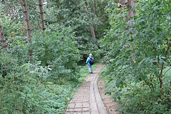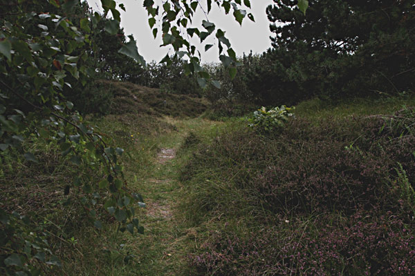 Man muss es nur finden. Gegenüber vom Inselfriedhof zweigt ein schmaler Weg ( der Tuunpadd) ab und dieser führt ins Wäldchen. Hier kann man auch nur zu Fuß gehen.Am Ende des Pfades sollte noch eine Aussichtsdüne sein, man nennt sie auch die Liebeslaube, so erzählen uns andere, die auch dorthin wollen. Aber alles ist abgesperrt und verbarrikadiert.
