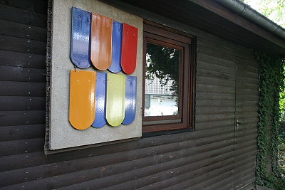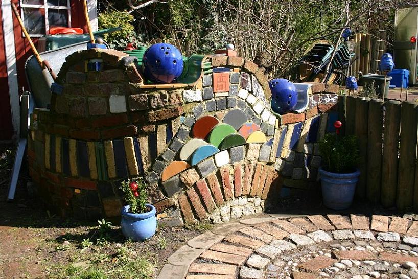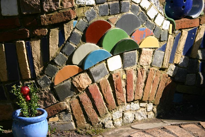 Übrigens noch ein paar Tipps für die Errichtung: Das Schwierigste war eigentlich die Beschaffung der Materialien. Diese runden Keramikteile haben wir von einem bekannten bekommen, der bei der Dachdeckerinnung arbeitet. Es sind bunte Kermaikdachziegel. Er hat und dann auch noch diverses sonstiges farbenprächtiges Material aus der Dachdeckung mitgebracht. So etwas müsste man ja auch käuflich erwerben können. Ansonsten sind wir durch viele Baumärkte getigert, um die einzelnen Steine zu beschaffen. Die Mauer hat innen einen schlichten weißen Kern auch Lochsteinen, wie man sie für den Kellerbau verwendet. Ich versuche mal ein Foto im Anfangszustand zu finden und einzuscannen. Vielleicht hat Okke auch noch ein digitales, damit man sich vorstellen kann, wie man beginnen muss. Natürlich muss zuvor auch ein Zementfundament im Boden gegossen werden für die Stand sicherheit. Gruß Heike