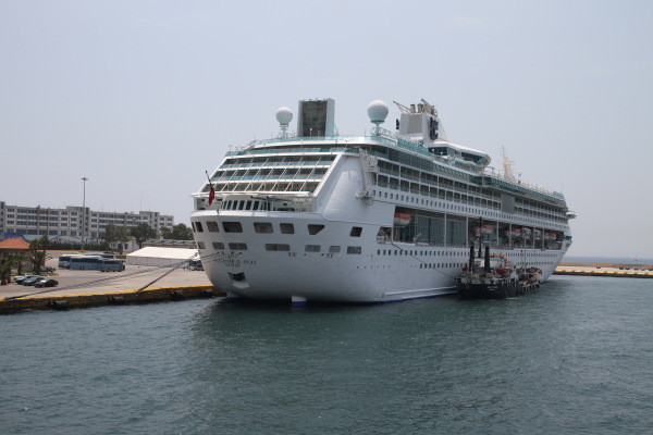 Kaum waren wir drauf, fuhr die Fähre ab. Die Überfahrt verlief relativ unproblematisch, bis wir an den Hafen von Piräus kamen. Es lag ein Riesenkreuzfahrtschiff am Pier: die Splendour of the Seas, ein Schwesternschiff der Rhapsody of the Seas, also konnte mir Oma alles zeigen, während drei andere Schiffe den Hafen verließen, damit genügend Platz für unsere Fähre war.