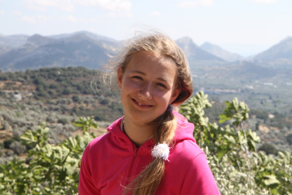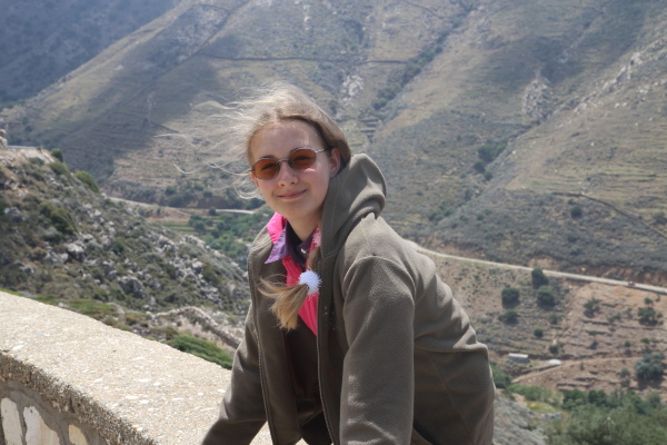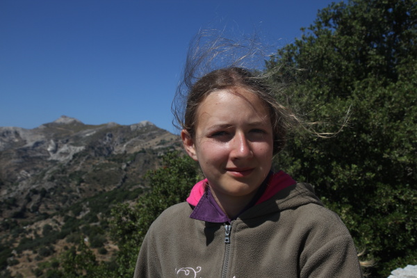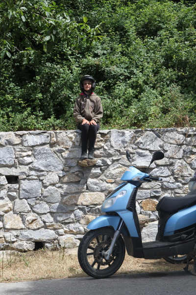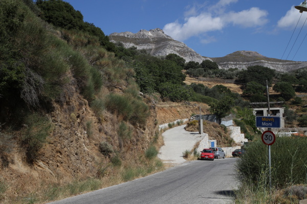 Nachdem wir zurück am Motorroller waren, waren wir frisch und voller Tatendrang. Also fuhren wir den Weg nach Moni, der hoch in die Berge hinauf ging. Oma machte zwischendurch immer wieder Fotos von der Umgebung, obwohl wir dabei vermutlich einige Verkehrsregeln brachen. An einem Berg war der Wind so stark, als wir an der Luvseite fuhren, so dass das Fahren schon sehr schwierig wurde und es einmal so war, dass Oma bei einer Serpentine vom Wind aus dem Kurs gebracht wurde. Sie fuhr nämlich erst innen auf der rechten Seite und befand sich innerhalb von Sekunden auf der linken Spur. Aber da die Straßen ziemlich verlassen waren, hatten wir damit keine Probleme.