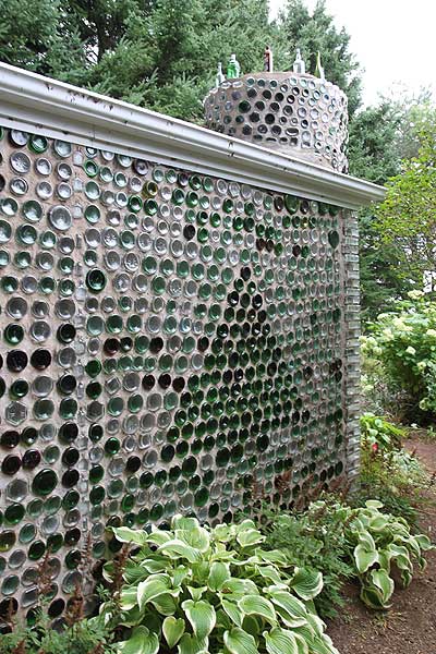 Keine Angst, die Flaschen wurden nicht alle vom Erbauer geleert. Es gab zu dieser Zeit noch kein Recycling von Glas außer für Cola/Fanta/Sprite etc. (man nennt sie hier pop) und Bierflaschen. So fuhr Édouard Arsenault jede Woche mit seinem Truck zu Einrichtungen wie Tanzschuppen, Restaurants und zur Müllhalde und holte von dort Flaschen. Bald sprach sich herum, dass er diese Bottle-House-Projekt angefangen und und viel brachten ihm Flaschen vorbei.